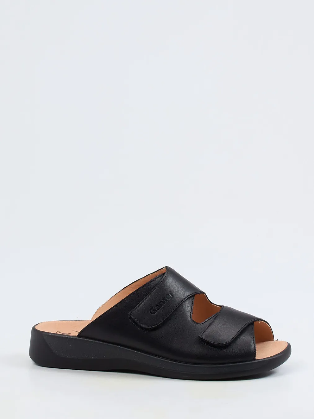 Komfort für jeden Schritt.Die Marke Ganter fertigt diese ergonomische Damen-Pantolette in hochwertigem Kalbleder. Ideal für entspannte Tage zu Hause oder im Alltag, kombiniert sie ein samtig mattes schwarzes Finish mit verstellbaren Klettverschlüssen für optimalen Sitz. Das ergonomisch geformte, lederbezogene Fußbett wird durch ein weiches Lederfutter ergänzt. Eine profilierte PU-Sohle mit Luftpolsterung sorgt für sicheren Halt und angenehme Dämpfung. Das dezente Design mit Ton-in-Ton-Nähten und geprägtem Logo unterstreicht den minimalistischen Stil im Sinne aktueller Health-Aesthetics-Trends. Lässt sich hervorragend mit loungetauglicher Mode oder luftigen Sommerhosen kombinieren. Fußgerechter Komfort in zeitlosem Zumnorde-Stil.