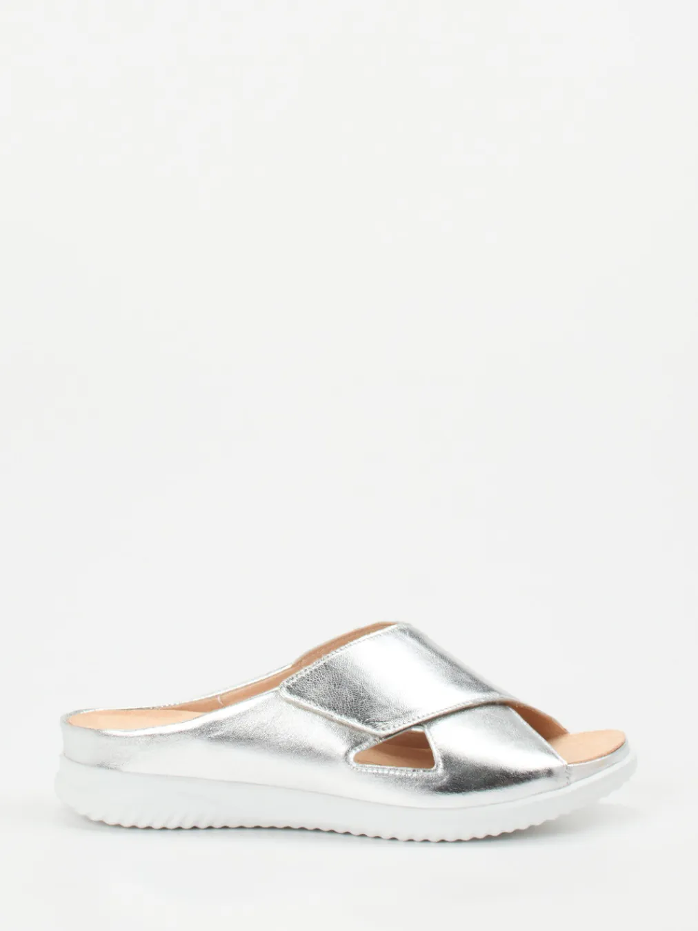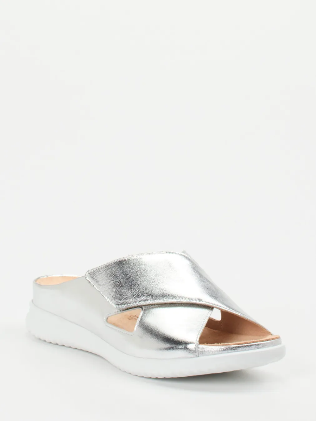 Die überkreuzten Riemen aus silbernem Metallicleder kombinieren ergonomischen Sitz mit modischem Glanz. Eine ideale Wahl für stilbewusste Trägerinnen mit Komfortanspruch.