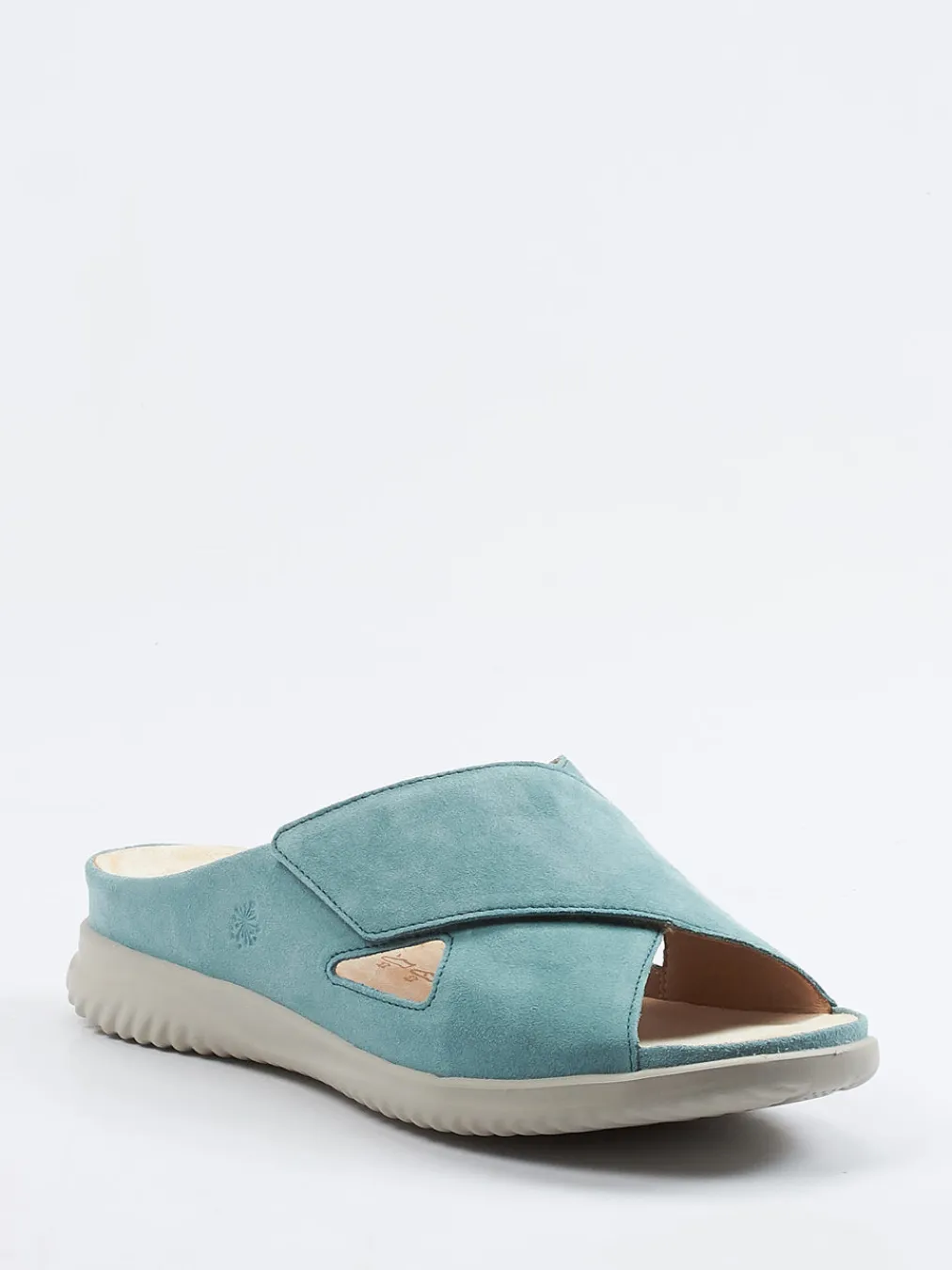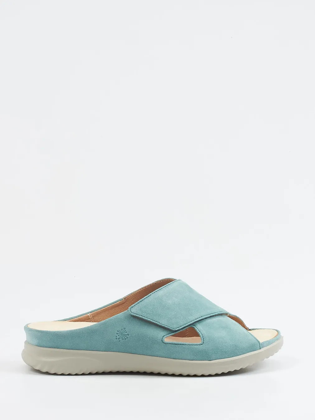Perfekt für entspannte Sommertage daheim oder unterwegs: Das mintfarbene Veloursleder ist samtig angeschliffen, die Riemen lassen sich per Klettverschluss individuell anpassen. Gekreuzte Riemen mit seitlichen Cut-Outs unterstreichen das luftige Design. Innen sorgt ein lederbezogenes, herausnehmbares Korkfußbett für ergonomischen Halt – auch für Einlagen geeignet. Die leichte, hellgraue Gummisohle mit Profil bietet sicheren Tritt. Farblich abgestimmte Nähte runden den minimalistischen Look ab.
