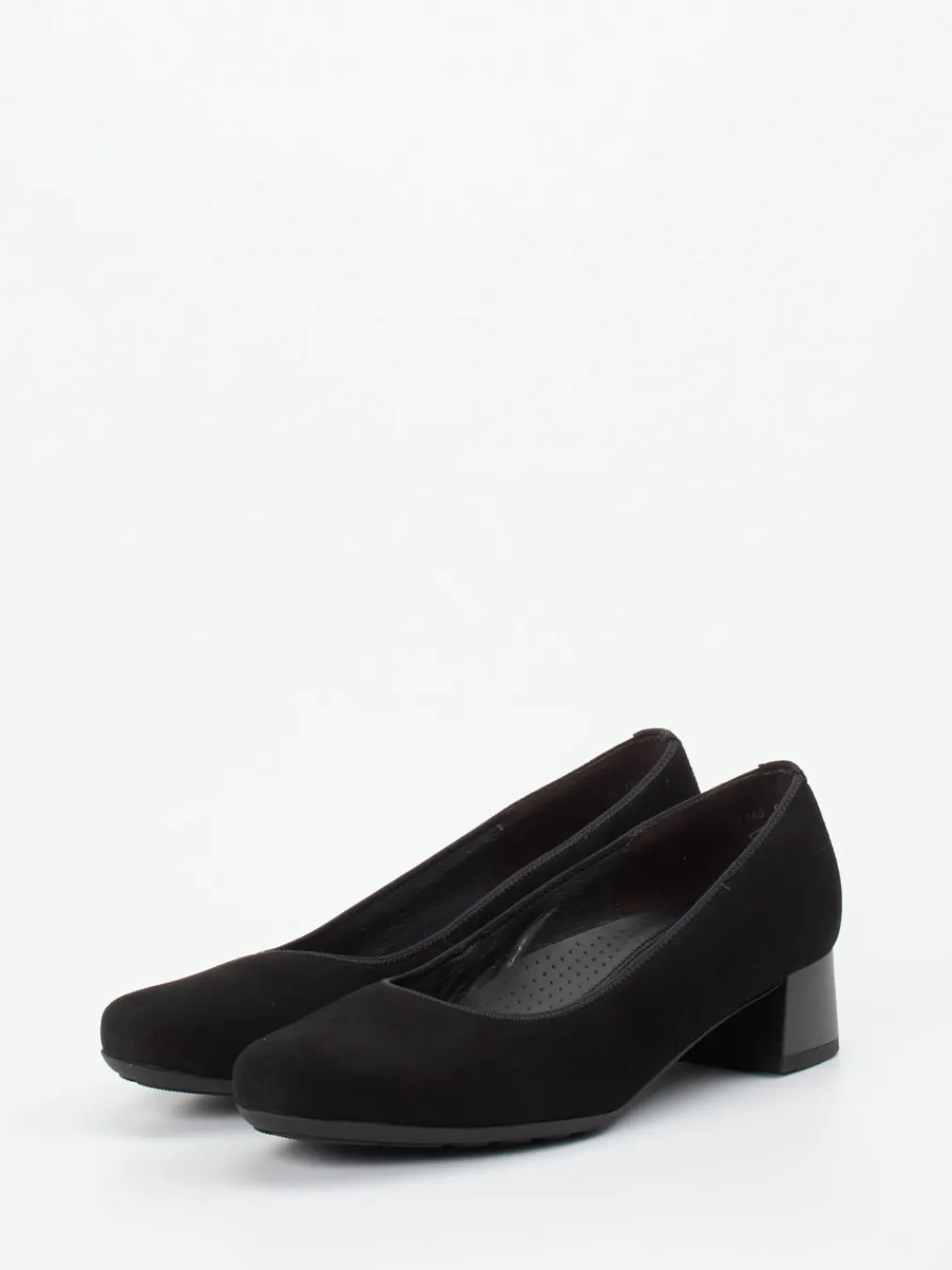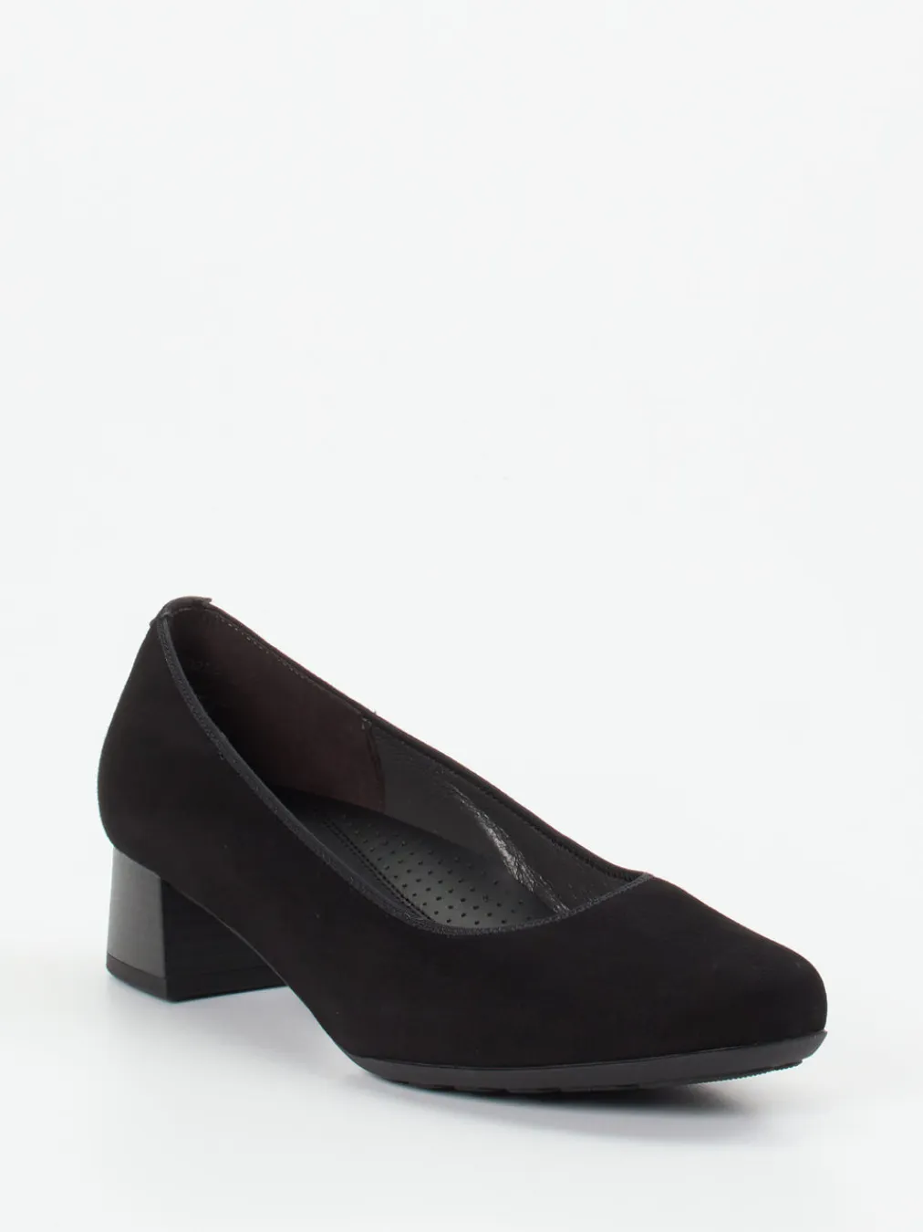 Der sanfte Velourslederbezug und die gepolsterte Innensohle machen diesen schwarzen Komfort-Pump zur idealen Wahl für lange Tage mit stilvollem Auftritt.