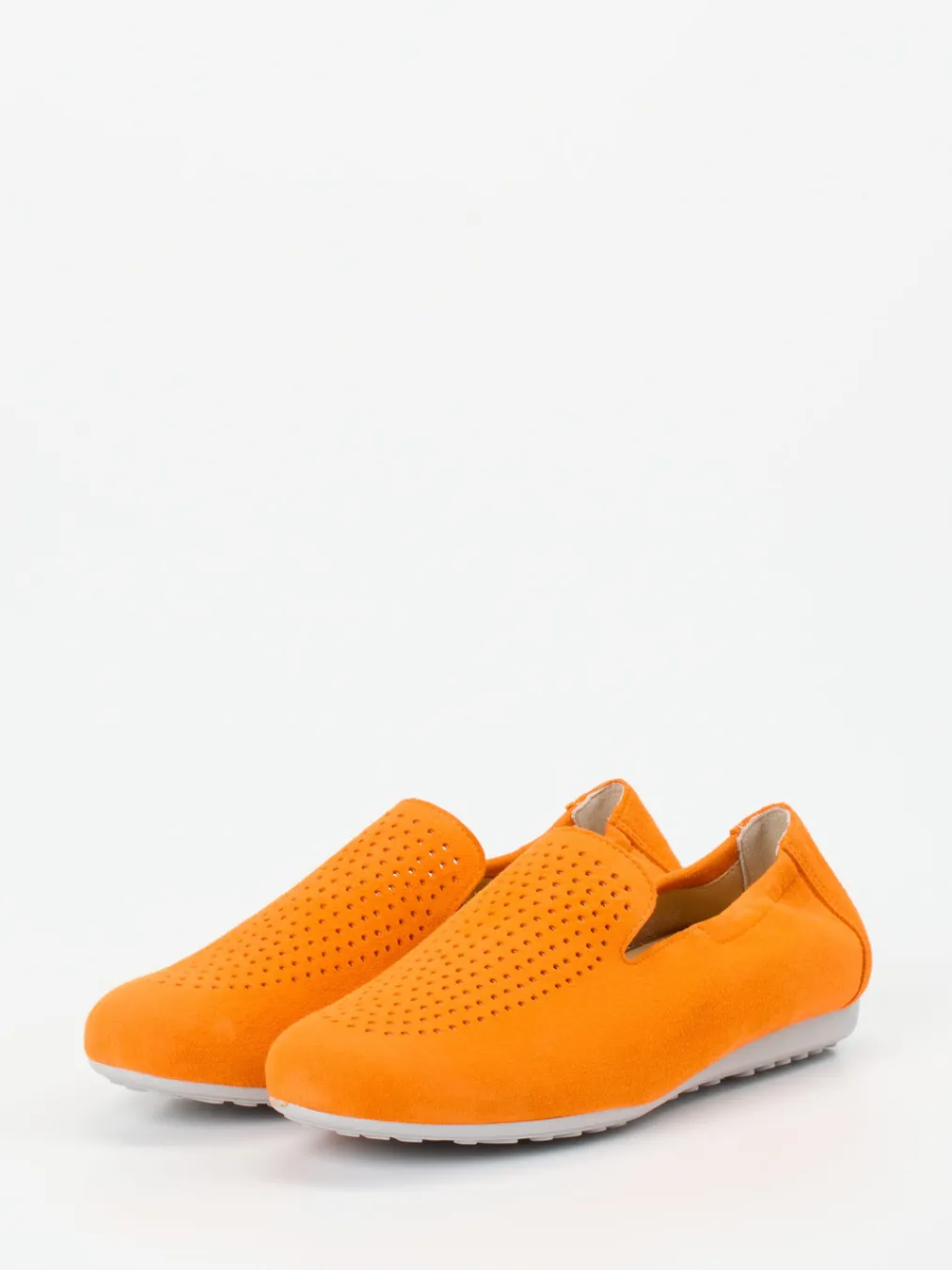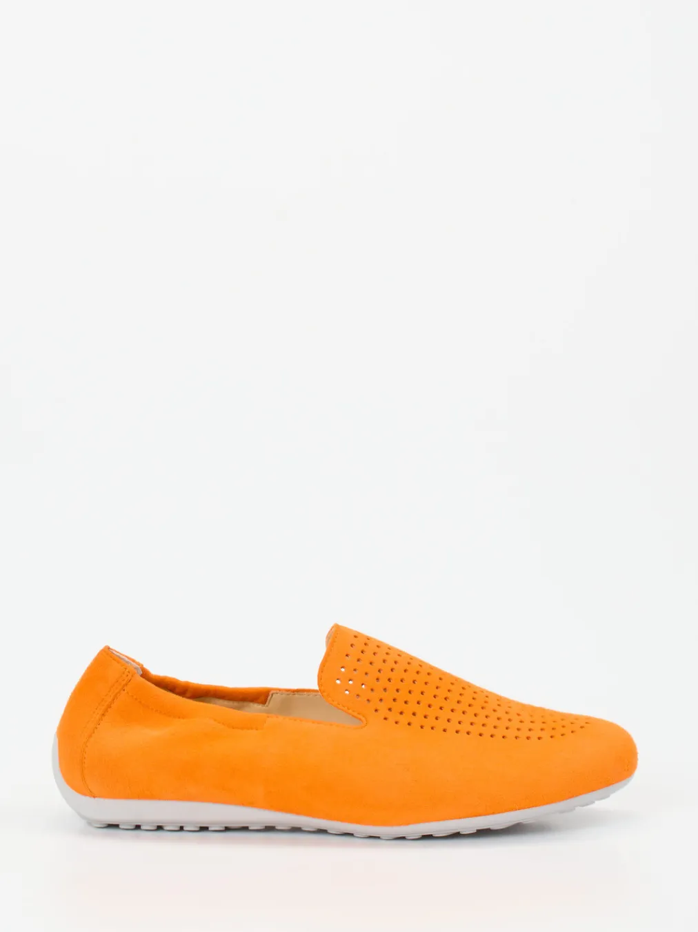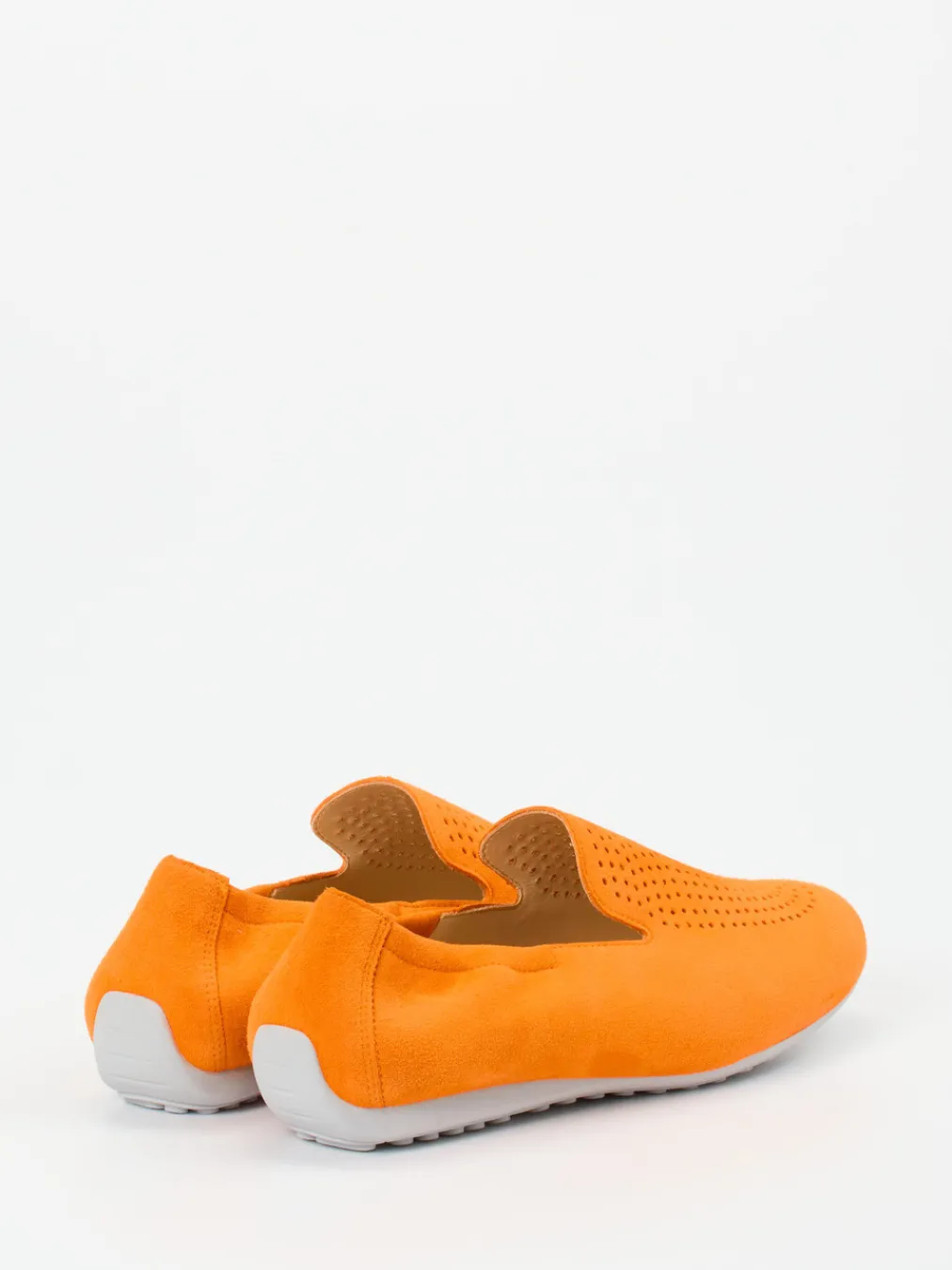 Farbenfroher Komfort für entspannte Sommertage.Semler präsentiert einen Komfort-Slipper für Damen, gefertigt aus hochwertigem Veloursleder mit samtiger Haptik und trendigem Farbton. Ideal für entspannte Spaziergänge oder als stilvolle Ergänzung sommerlich-lässiger Outfits: Das leuchtend orangefarbene Veloursleder mit perforiertem Vorderblatt verbindet luftige Leichtigkeit mit visuellem Eyecatcher-Potenzial. Die klassische Flatsilhouette mit Elastikeinsätzen sorgt in Kombination mit dem herausnehmbaren, weich gepolsterten Vario-Fußbett für angenehmen Halt, während die hellgraue, profilierte TR-Gummisohle jeden Schritt dämpft. Elemente des Comfort Designs und der Trendfarbe aus „Bold Colors SS24“ machen diesen Slipper besonders vielseitig. Semler steht für exzellenten Tragekomfort in durchdachtem Design.