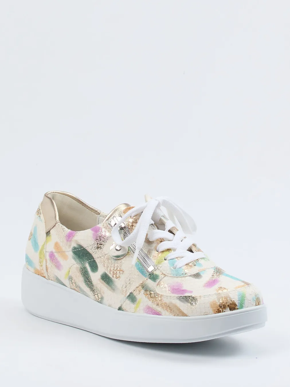 Modischer Komfort für jeden Tag.Waldläufer präsentiert einen Damen-Komfort-Sneaker in stilbewusster Ausführung. Ideal für Frühjahr und Sommer bietet dieser Sneaker in bequemer Weite K eine angenehme Unterstützung im Alltag. Das geprägte Leder mit dezenter Reptilstruktur und schimmerndem Finish vereint Cremeweiß mit pastellfarbenen Akzenten in Mintgrün, Flieder und Gold. Die klassische Rundform mit toniger Zunge und seitlichem Reißverschluss sorgt für ein leichtes Anziehen. Das ergonomische Wechselfußbett, gepaart mit einer stoßdämpfenden PU-Sohle, verspricht ganztägigen Komfort. Metallic-Details setzen zudem feminine Highlights im Trendfeld Modern Femininity. Waldläufer steht für Komfort in hochwertiger Verarbeitung mit modischem Anspruch.