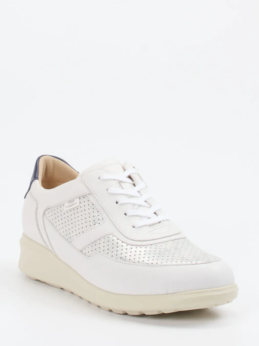 Bequem durch den Frühjahrstag.Finn Comfort präsentiert mit diesem Komfort-Sneaker ein Highlight für Alltag und Freizeit. Ideal für längere Wege oder entspannte Stunden: Das weiße Glattleder ist teils perforiert und partiell in silber-metallic gehalten – ein luftiger Look mit dezentem Glanz. Die rund ergonomische Silhouette, eine gepolsterte, farblich abgesetzte Fersenkappe sowie seitlicher Reißverschluss sorgen für hohen Tragekomfort. Innen überzeugt atmungsaktives Leder-Textilfutter und ein herausnehmbares Fußbett. Minimalistisches Design trifft auf modische Metallic-Details – passend zu softem Casualwear. Komfort trifft auf Funktionalität – typische Finn Comfort Qualität.