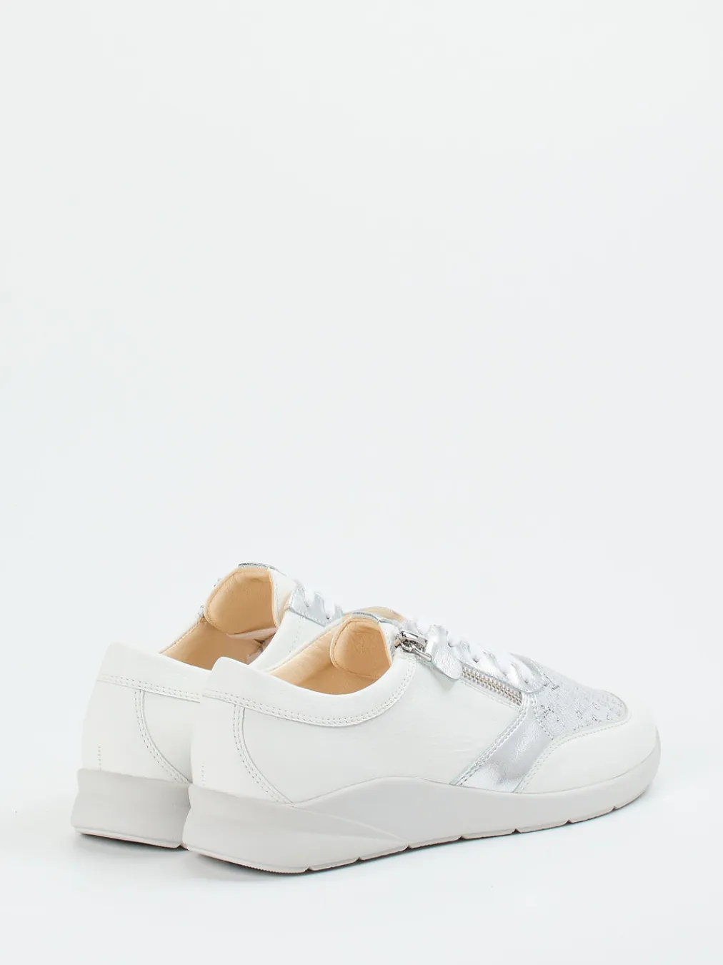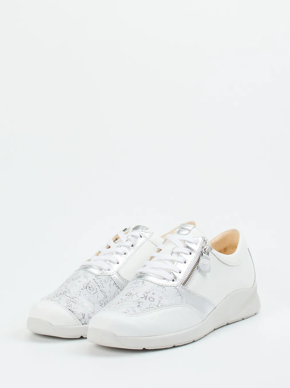 Dieser Sneaker kombiniert hochwertiges Kalbleder mit silberfarbenem Metallic-Finish und modernem Schriftmuster – ideal für stilbewusste Komfortliebhaberinnen.