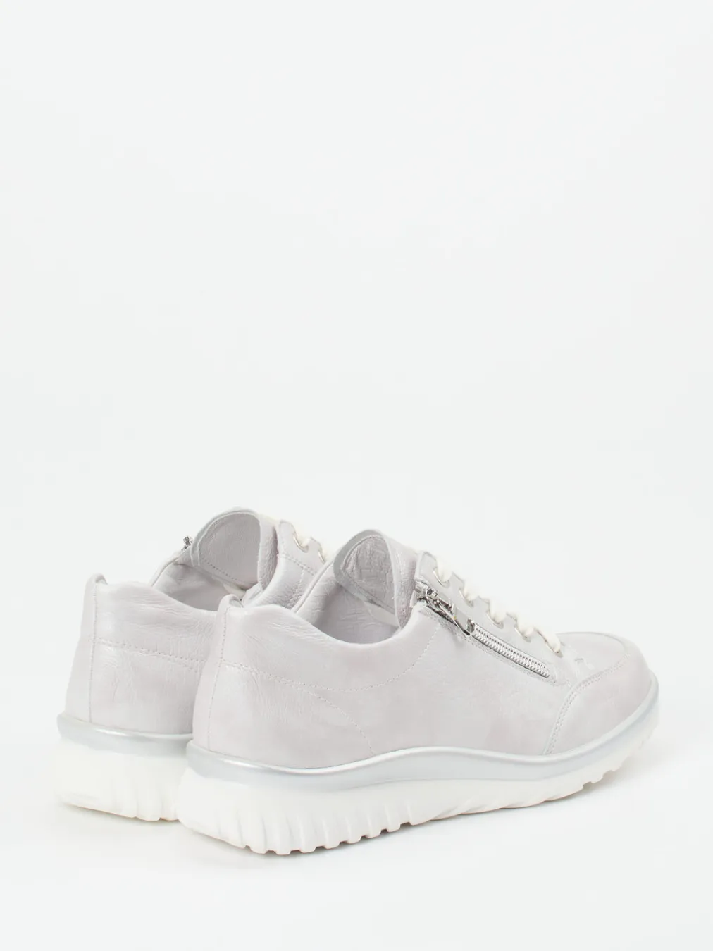 Ideal für lange Tage auf den Beinen: Der Sneaker aus matt verarbeitetem Kalbleder in softem Hellgrau bietet dank beidseitigem Einstieg über Schnürung und Reißverschluss hervorragende Alltagstauglichkeit. Die weich gepolsterte Gummisohle sorgt dabei für höchsten Tragekomfort. Ton-in-Ton-Nähte und ein silberfarbener Zierreißverschluss fügen sich harmonisch in das minimalistische Design ein. Ein Must-have für stilbewusste Trägerinnen, die auf Soft Neutrals und Quiet Luxury setzen.
