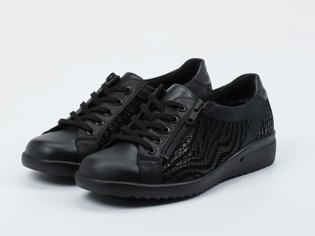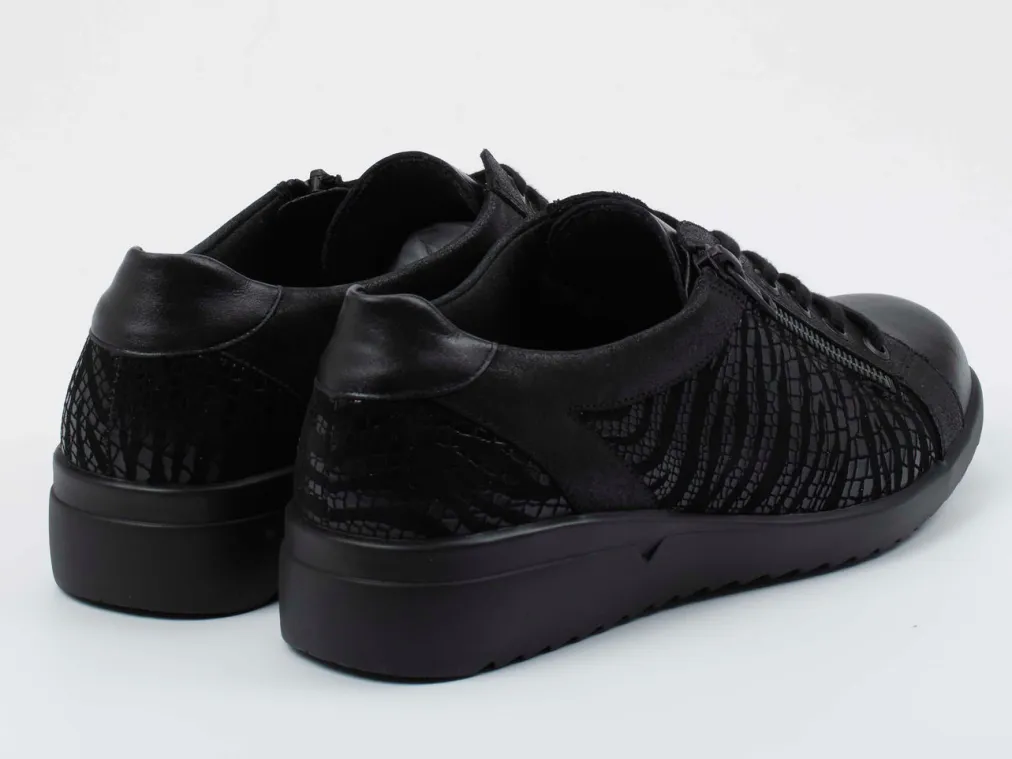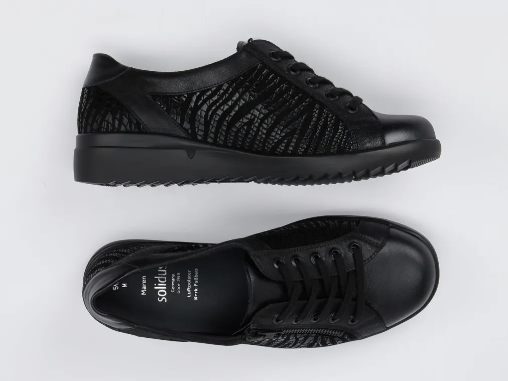Mehr Struktur im Alltag.Die Marke Solidus präsentiert mit diesem Komfort-Sneaker ein Modell aus der beliebten Maren-Form. Ideal für langes Gehen oder entspanntes Unterwegssein im Alltag eignet sich dieses Damenmodell mit seitlichem Reißverschluss und bequemer Luftpolstersohle. Der Materialmix aus Kalbleder, samtig-schimmerndem Veloursleder und strukturiert geprägter Synthetik erzeugt in Schwarz ein raffiniert glänzendes Animal-Finish. Der rund geschnittene Sneaker mit toniger Schnürung vereint Casual-Look und durchdachte Komfortfunktionen. Die profilierte Gummisohle unterstützt bei jedem Schritt. Die auswechselbare Innensohle macht das Modell auch für Einlagetägerinnen ideal. Ein Solidus-Sneaker, der Alltagstrends mit wohltuender Funktion verbindet.