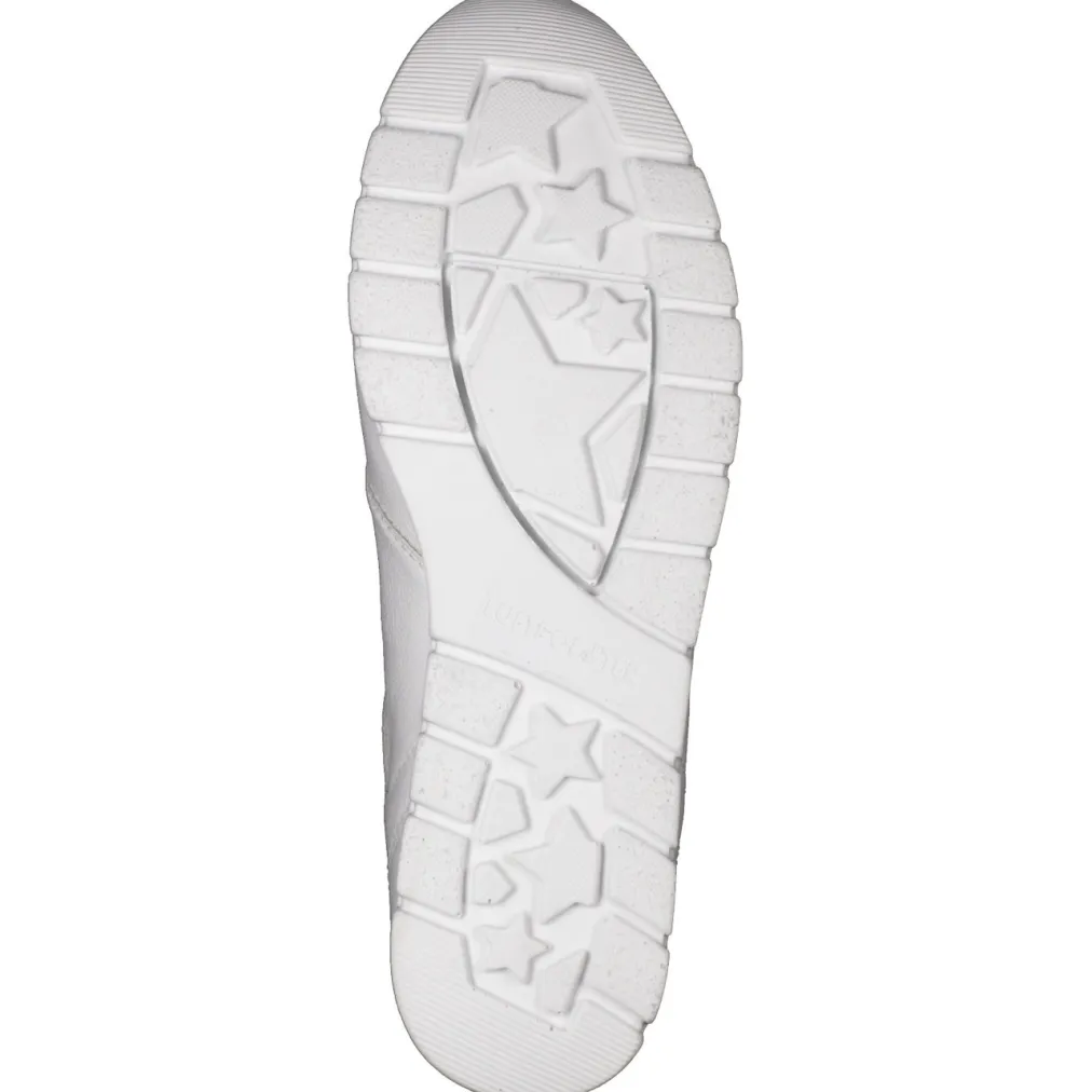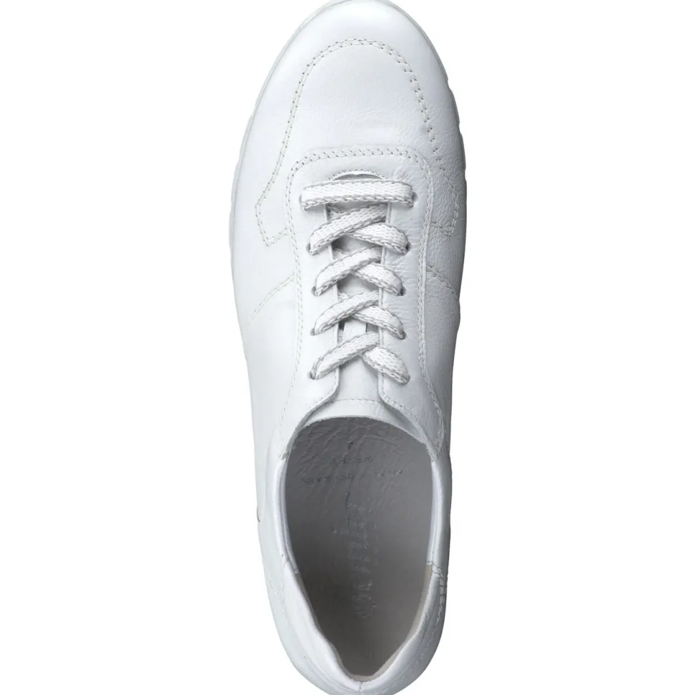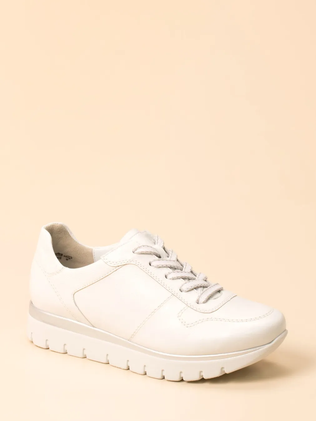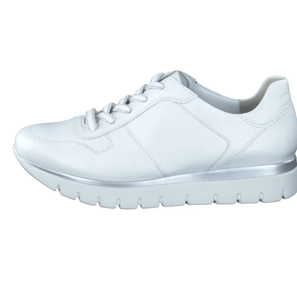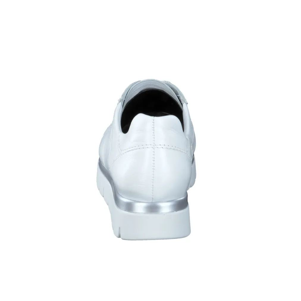 Ob beim Stadtbummel oder in entspannter Alltagsroutine – der Sneaker aus weißem Kalbleder mit matter Struktur und Offwhite-Nuance bietet angenehmen Halt. Die breite Schnürung sorgt für einfache Anpassung, während die gelenkschonende PU-Sohle mit silberfarbenem Rahmen optisch wie funktional Akzente setzt. Die Silhouette bleibt sportlich-klassisch mit betontem Schaftrand und gepolstertem Wechselfußbett. Ein Trend-Update liefern subtile Metallic-Details und Komfort-Technologie. Ideal zu pastellfarbenen Steppjacken oder hellen Lederaccessoires.