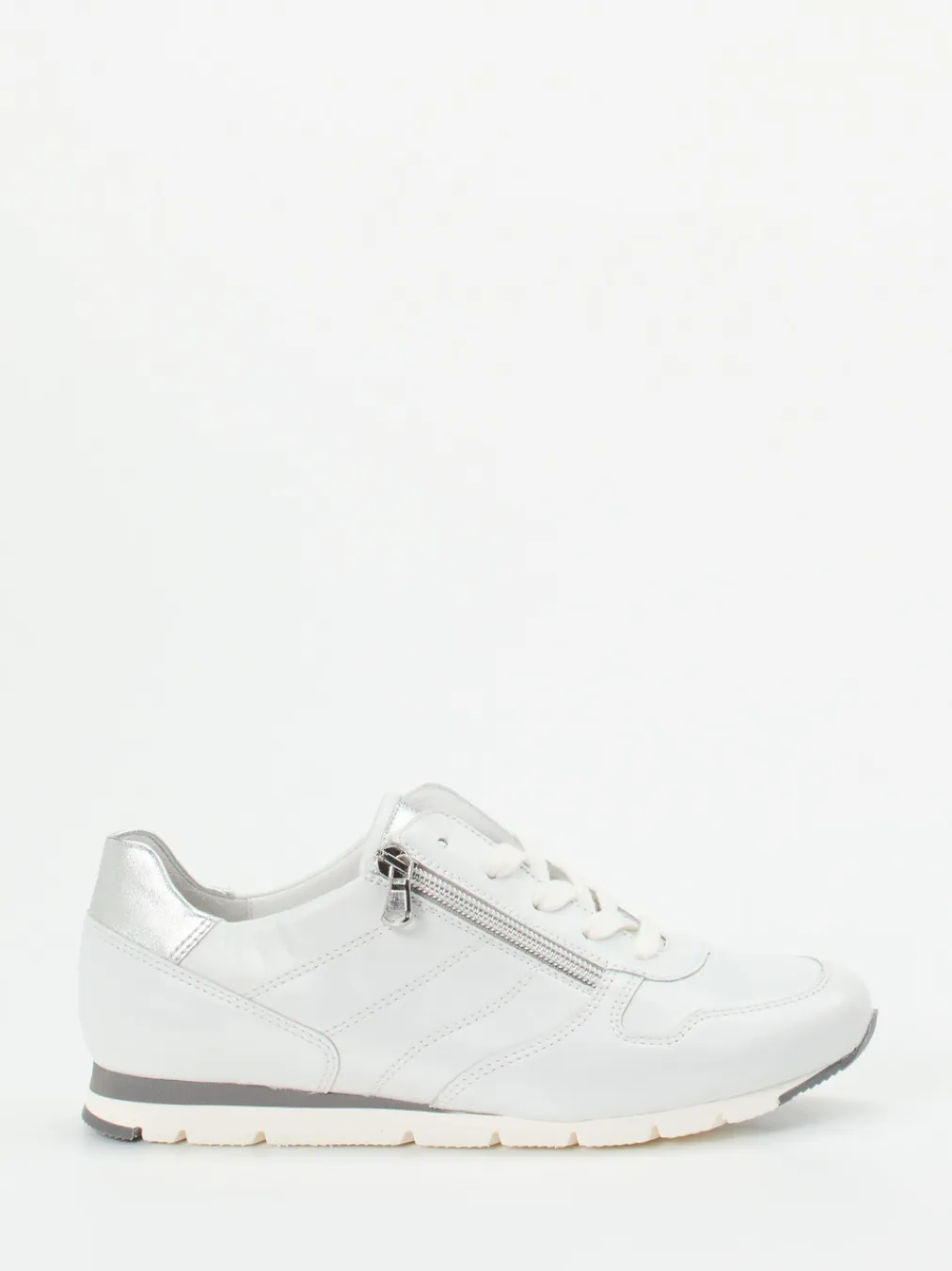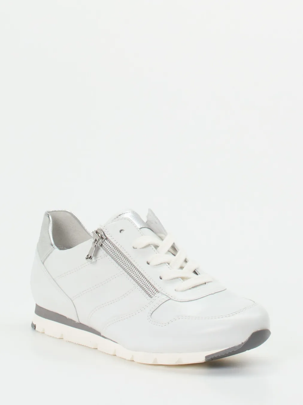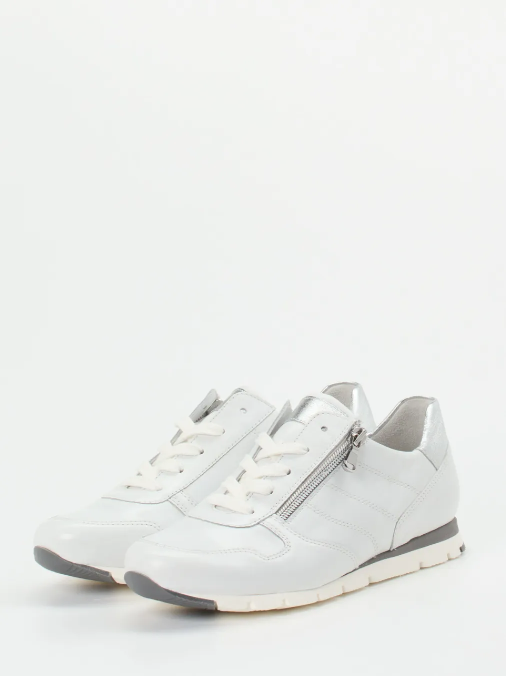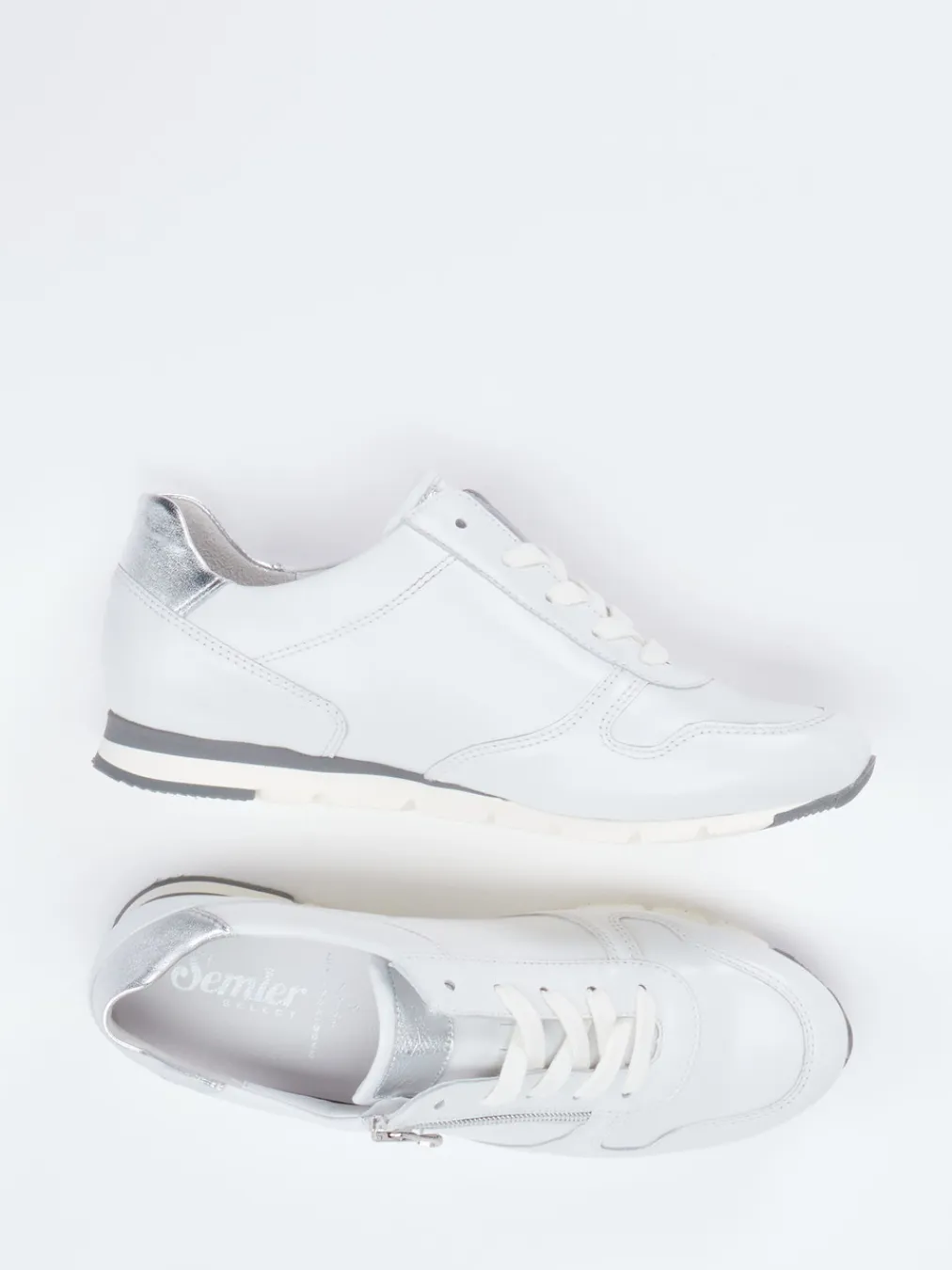 Perfekter Mix aus Komfort und Ästhetik.Der Komfort-Sneaker von Semler überzeugt durch hochwertige Verarbeitung und durchdachte Funktionalität. Für entspannte Alltagsmomente bietet das Modell aus weißem Kalbleder mit glänzendem Finish und silberfarbenen Metallic-Akzenten an Ferse und Zunge stilvollen Mehrwert. Klassisch-sportliche Silhouette, seitlicher Reißverschluss, tonige Schnürung und rutschhemmende Gummisohle ermöglichen komfortables Tragen und einfaches Handling. Metallic-Details und die klare Formgebung passen zum modernen Streetwear-Trend. Besonders harmonisch wirkt die Kombination mit hellen Casual-Hosen oder einer silbernen Crossbody-Bag. Semler steht für bequeme Passform und dezente Eleganz mit femininer Ausstrahlung.