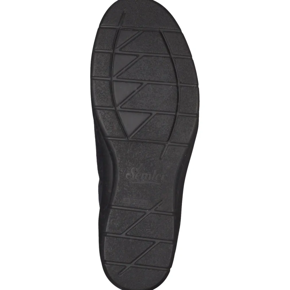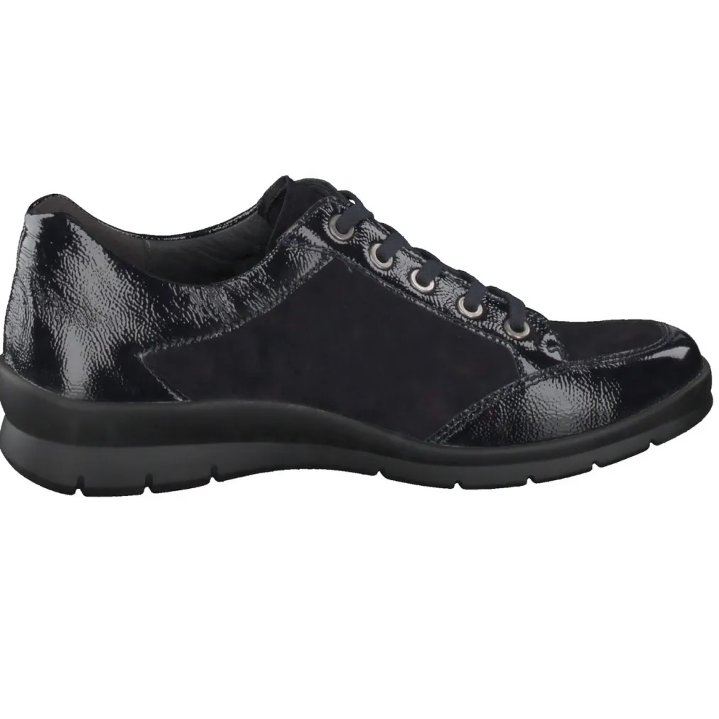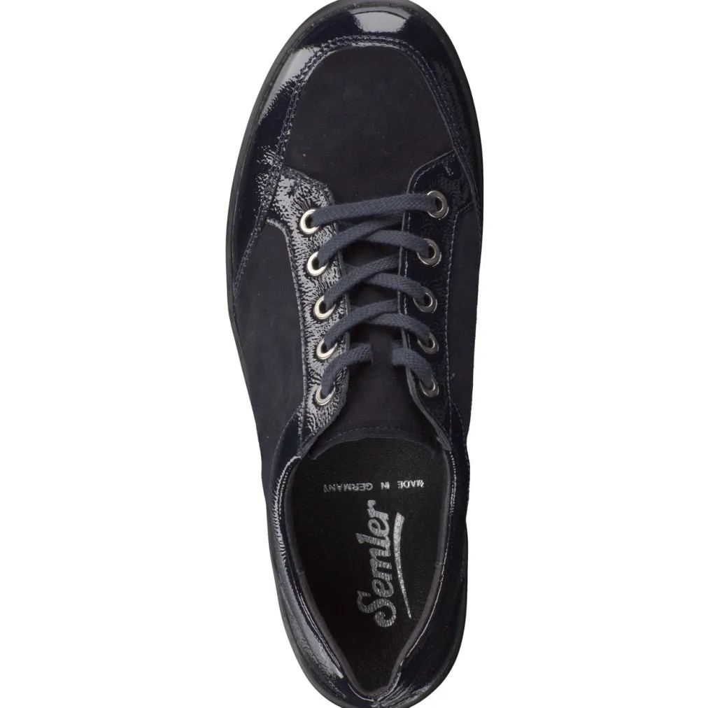 Komfort trifft auf glänzende Zurückhaltung.Der Komfort-Sneaker von Semler ergänzt die Damenlinie um ein mitternachtsblaues Modell aus Lack- und Veloursleder. Für längere Wege im Alltag oder entspannte Stunden zu Hause bietet das ergonomische Wechselfußbett zusammen mit einer profilierten Luftpolstersohle optimalen Gehkomfort. Der raffinierte Materialmix aus Lackleder mit Crinkle-Effekt und samtig strukturiertem Veloursleder sorgt für dezente Tiefe im Ton-in-Ton-Design. Klassisch rund geformt und mit Ton-in-Ton-Schnürung versehen, besticht dieser Sneaker durch unaufdringliche Eleganz. Der Look passt ideal zu Stretch-Jeans oder Softshell-Jacke. Hochwertige Materialien und durchdachter Tragekomfort sind typisch Semler.