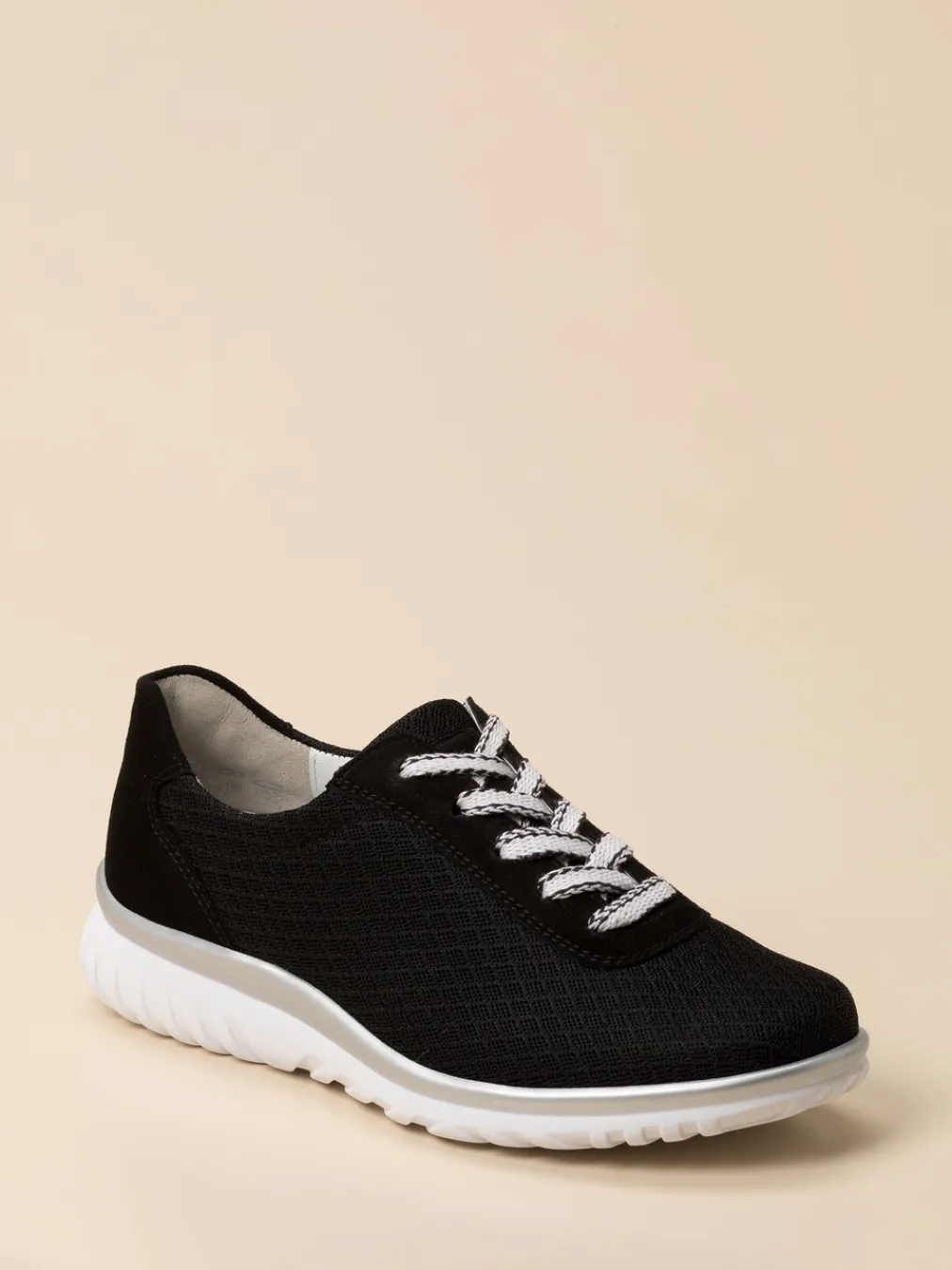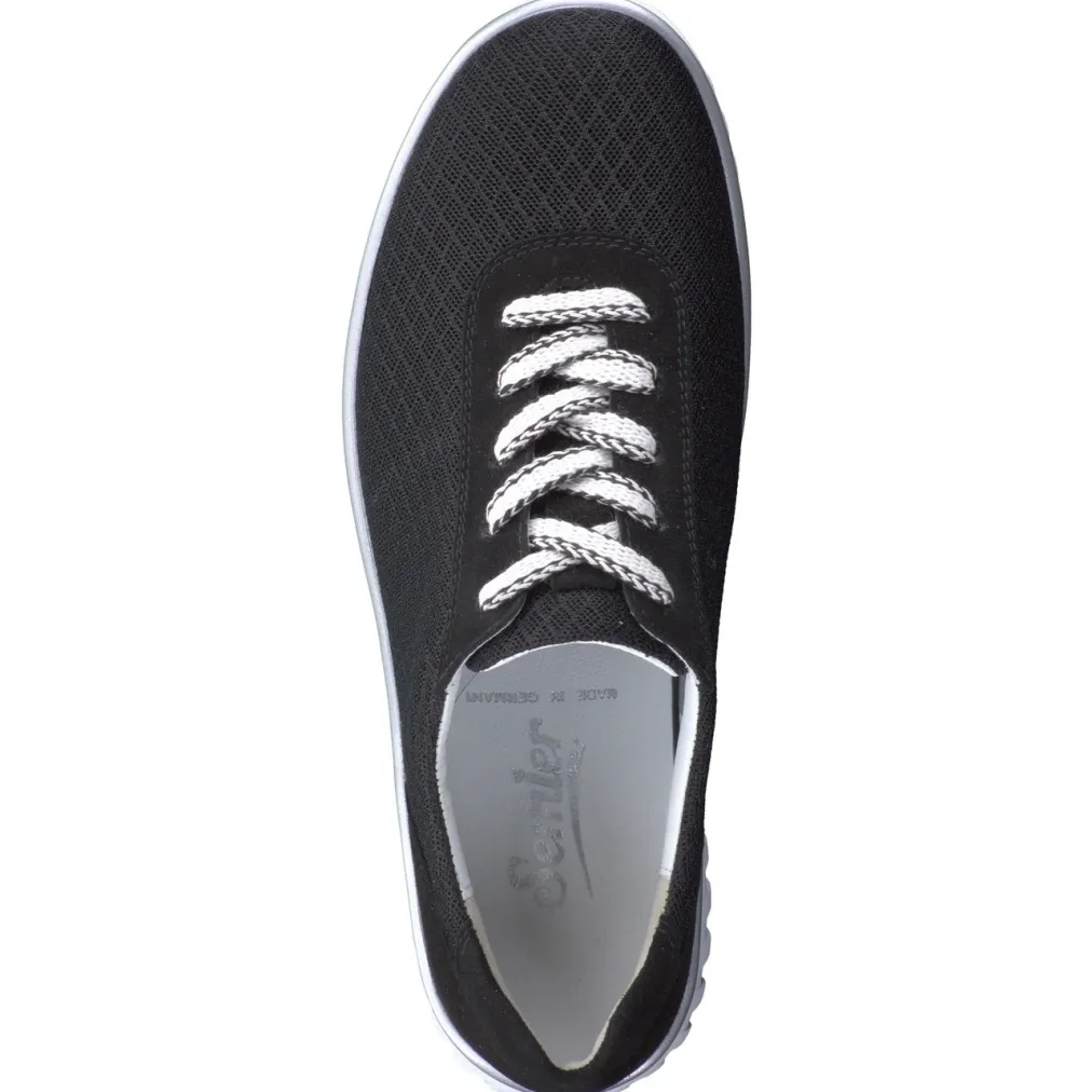 Sportivität trifft Komfort.Semler präsentiert mit diesem Komfort-Sneaker ein modisch-funktionales Damenmodell für entspannte Aktivitäten und den Alltag. Das schwarze Mesh-Textil sorgt in Kombination mit samtigem Veloursleder für ein atmungsaktives und angenehm strukturiertes Tragegefühl. Der flache Schnitt, gepolsterte Schaftrand sowie die profilierte PU-Sohle in Weiß und Silber unterstreichen die sportliche Ausrichtung. Zweifarbige Schnürsenkel setzen dezente Kontraste. Die Weite H und das herausnehmbare Fußbett garantieren Komfort auch bei längeren Strecken. Stilsicher im Trendsegment „Comfort Core SS24“ platziert. Vielseitiger Alltagsbegleiter mit markenbekanntem Fokus auf Bequemlichkeit.