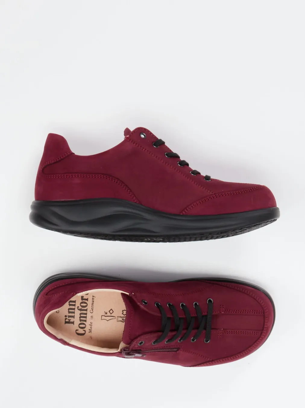 Ob beim Stadtspaziergang oder auf dem Weg zur Arbeit – das bordeauxrote Nubukleder mit matter Oberfläche bietet eine angenehme Haptik und stilvolle Zurückhaltung. Die runde, ergonomische Form wird durch einen weich gepolsterten Schaftrand ergänzt. Schwarze Schnürsenkel und ein seitlicher Reißverschluss sorgen für praktischen Einstieg und einen sportiven Akzent. Die rutschhemmende Gummisohle und das orthopädisch geformte, herausnehmbare Korkfußbett unterstreichen die Alltagstauglichkeit. Minimalistische Details, inspiriert von Komfortschuh-Design und aktuellem Functional Fashion Trend, runden das Modell harmonisch ab.