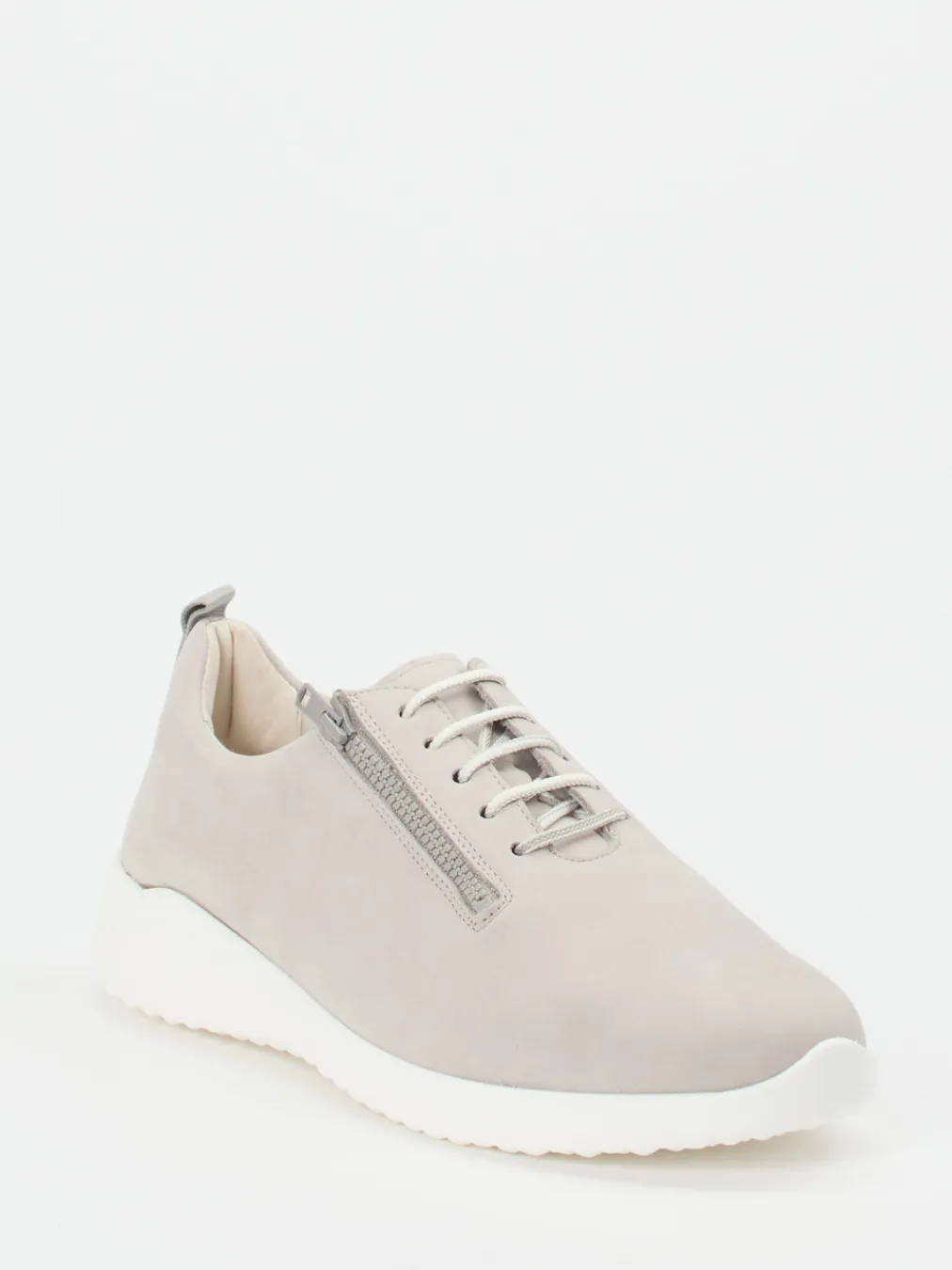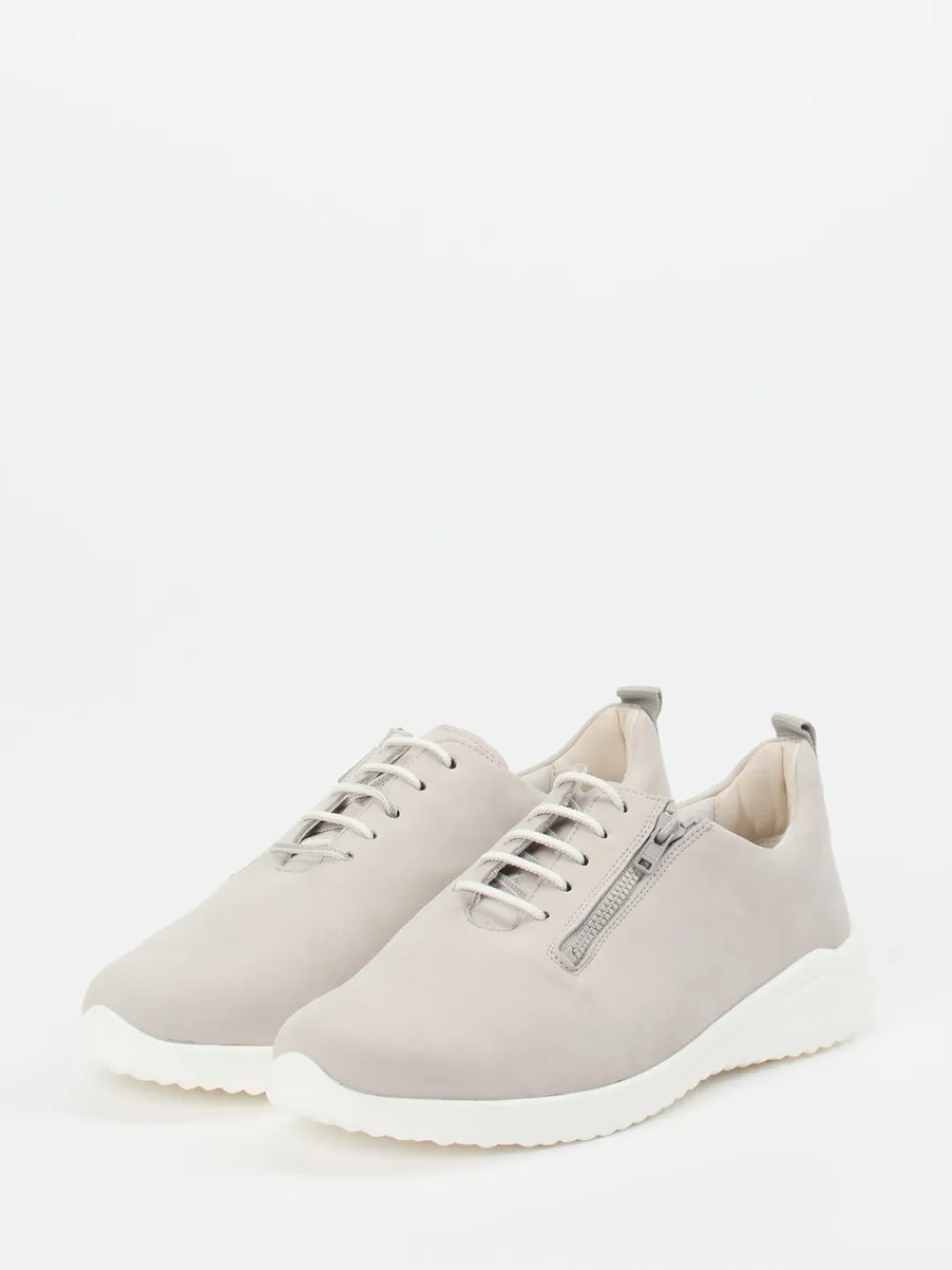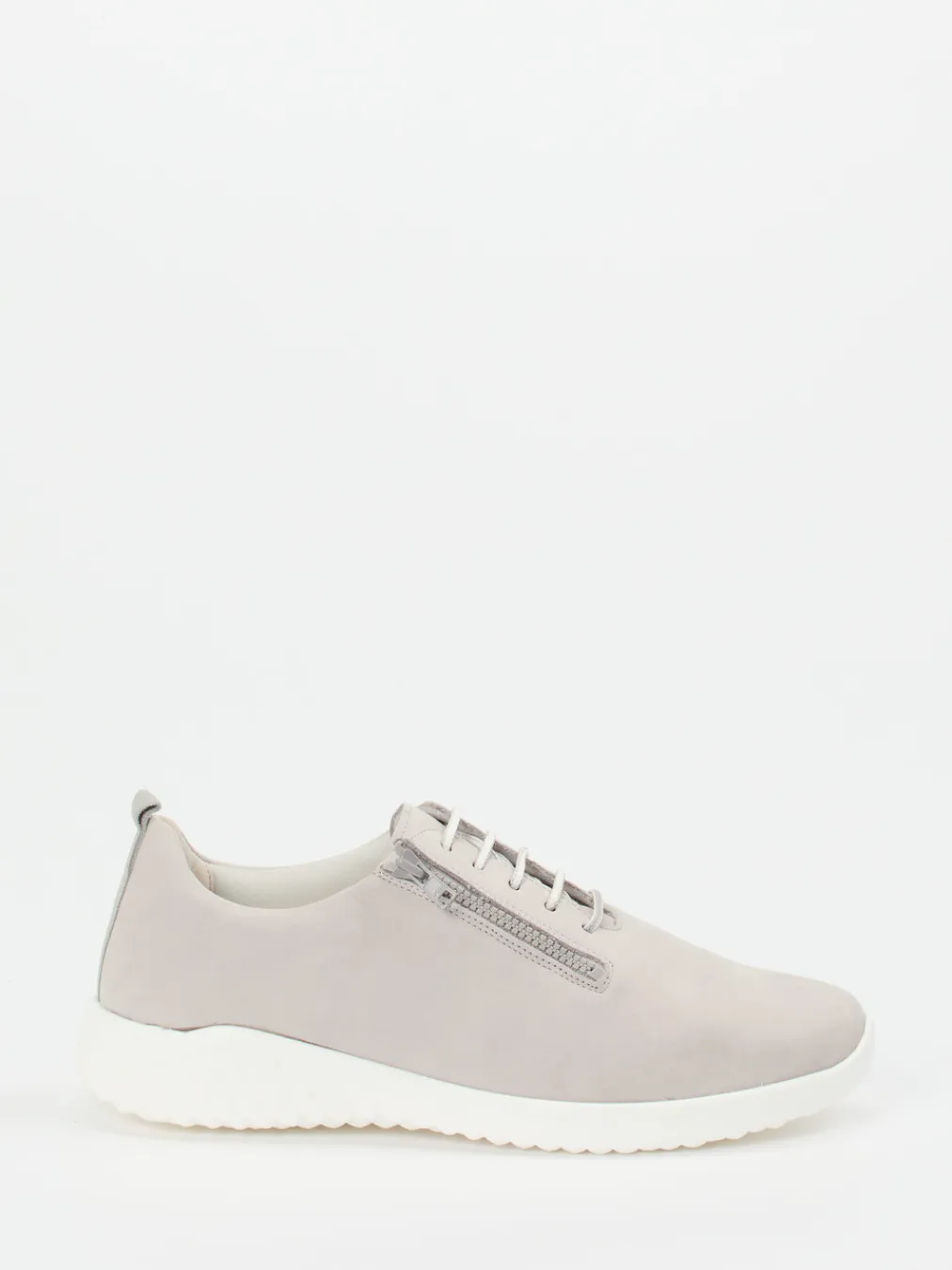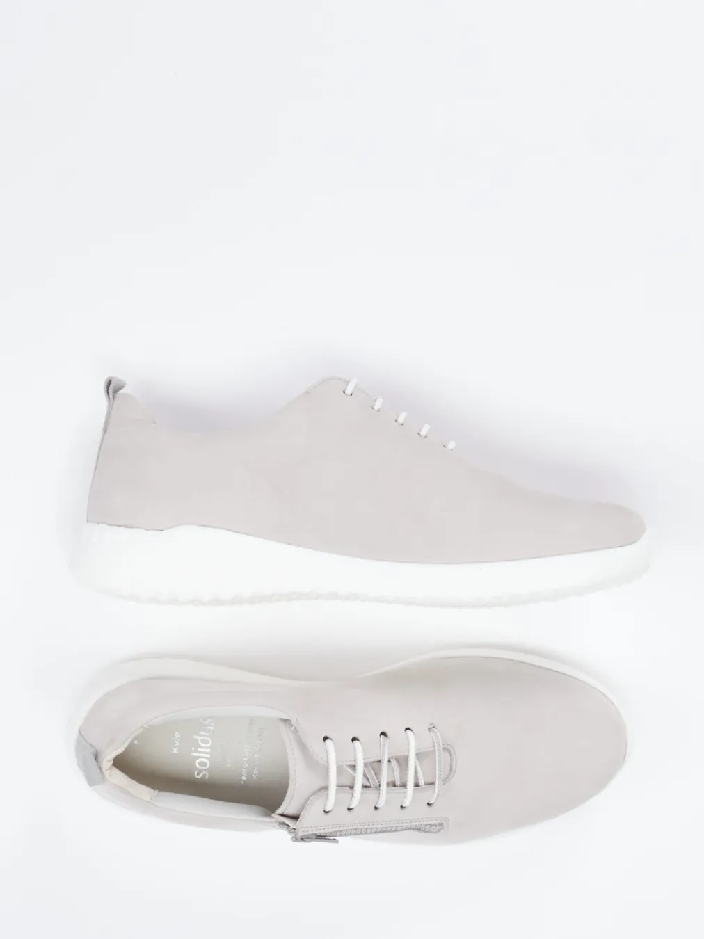 Minimalismus mit Funktion.Der Komfort-Sneaker von Solidus überzeugt als alltagstauglicher Damenschuh für entspannte Freizeitmomente. Weiches Nubukleder, samtig angeschliffen, trifft auf eine in Hellgrau gehaltene, unifarbene Oberfläche mit tonigen Nähten. Die Kombination aus Schnürung und seitlichem Reißverschluss vereinfacht den Einstieg deutlich. Eine weiße PU-Sohle mit Luftpolsterstrukturen bietet gute Dämpfung bei gleichzeitig modern-minimalistischer Silhouette. Die herausnehmbare Innensohle unterstützt lose Einlagen. Typisch für den „Quiet Luxury“-Trend harmoniert die gedeckte Farbigkeit mit einem betont zurückhaltenden Design. Solide Bequemlichkeit in stilbewusster Verarbeitung – das ist Solidus-Komfort pur.