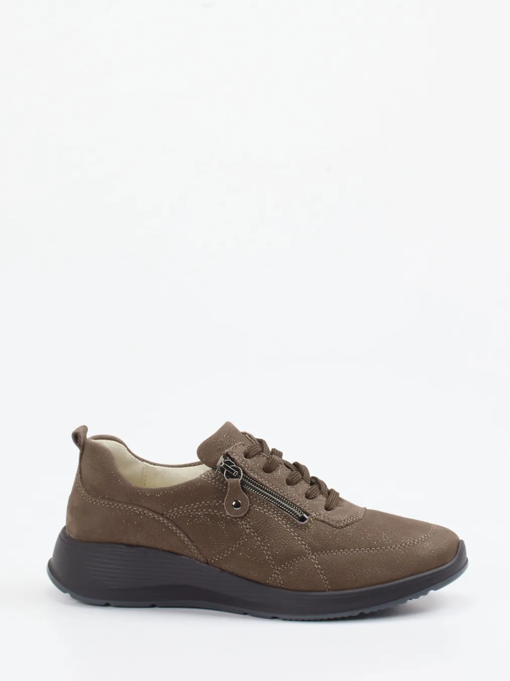 Schrittfest mit Stil.Waldläufer präsentiert mit diesem Komfort-Sneaker ein Modell für anspruchsvolle Alltagsmomente. Das hochwertige Nubukleder in dunklem Braun zeigt sich samtig genarbt und betont die runde, ergonomische Silhouette. Tonige Schnürsenkel und ein seitlicher Reißverschluss ermöglichen bequemes An- und Ausziehen. Die flexible Gummisohle mit griffigem Profil bietet Trittsicherheit. Silberfarbene Details und die dezente Zuglasche an der Ferse runden das minimalistisch-funktionale Design ab. Ideal für Relax-Tage oder längere Stadtspaziergänge – auch für Einlagen geeignet. Waldläufer steht für kompromisslose Bequemlichkeit mit zeitgemäßem Komfortanspruch.