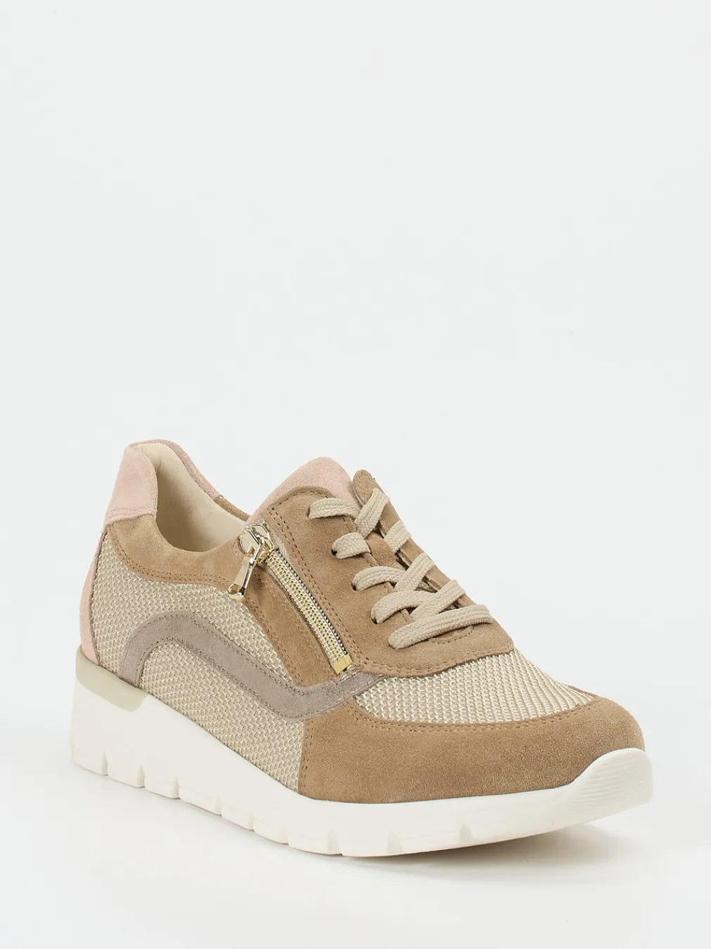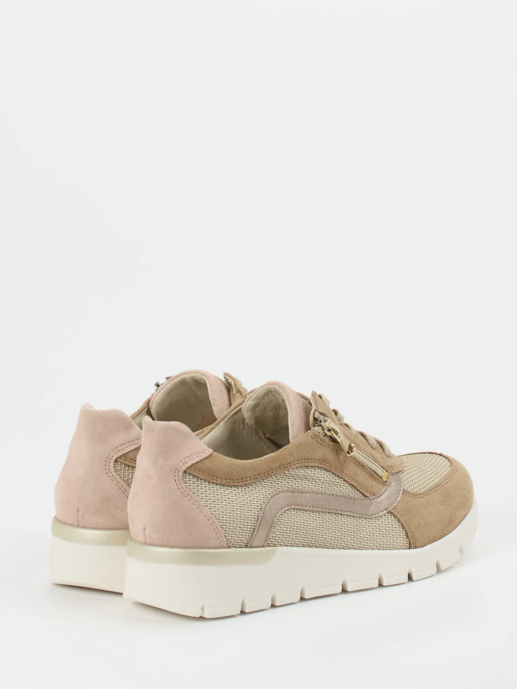 Ideal bei langen Wegen oder urbanen Erledigungen verbindet dieses Modell softes Veloursleder mit atmungsaktivem Meshtextil – samtig in der Haptik, strukturiert im Look. Die Farbmischung aus Beige, Rosé und Beigebraun vermittelt dezente Eleganz, während goldfarbener Reißverschluss und Metallic-Applikationen feine Hingucker setzen. Die ergonomisch geformte, profilierte Gummisohle wirkt stoßdämpfend und sorgt für sicheren Tritt. Minimalistische Streetwear-Elemente greifen aktuelle Trends auf und passen bestens zu Jogpants oder fließenden Sommerkleidern.