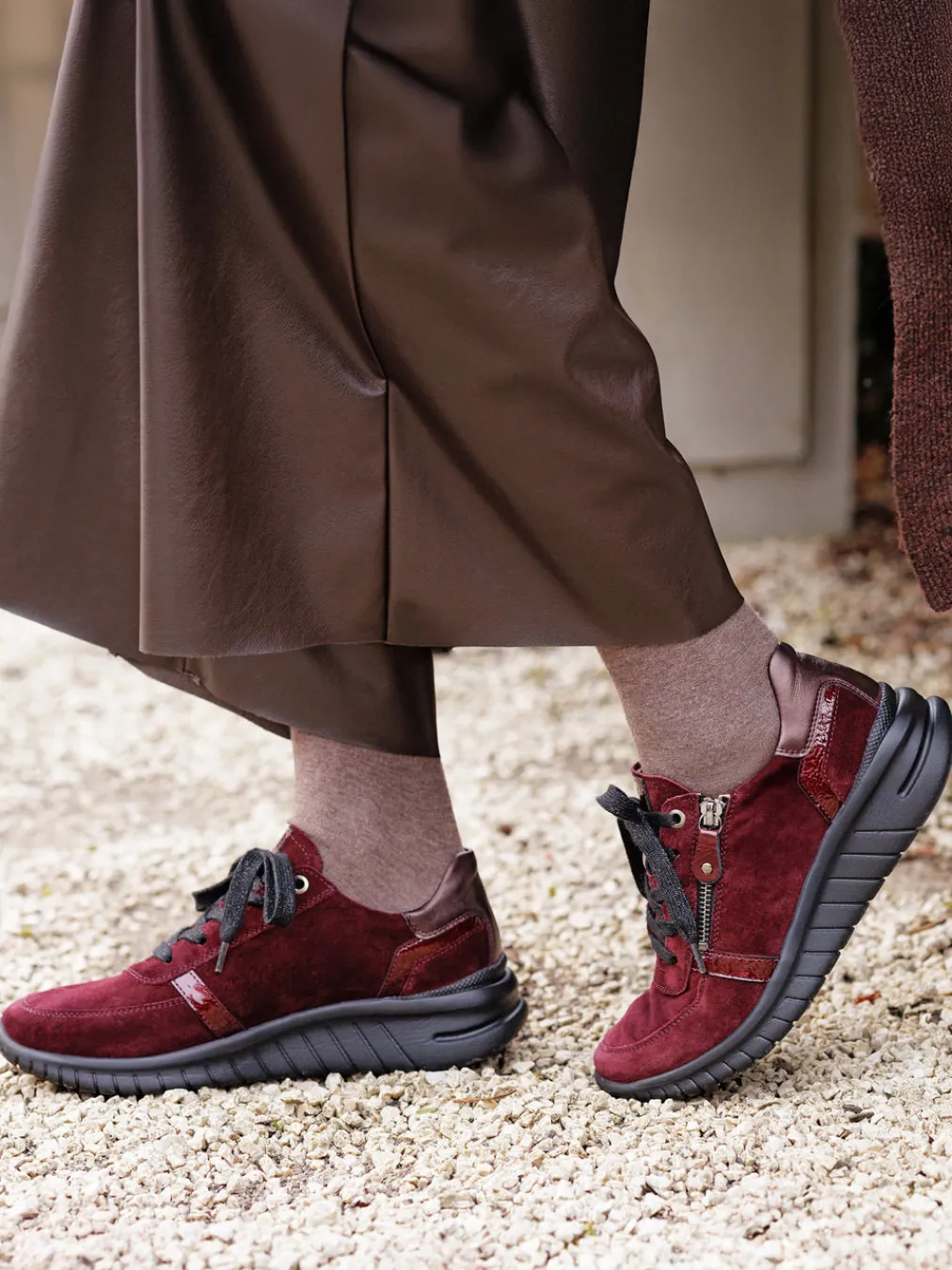 Viel Komfort im Alltag. Hartjes präsentiert einen modernen Komfort-Sneaker für Damen, gefertigt aus hochwertigem Veloursleder. Das bordeauxrote Modell überzeugt mit geschmackvoll mattem Finish und glänzenden Lackdetails an Ferse und Seiten. Die klassisch-sportliche Silhouette verläuft leicht keilförmig und sorgt gemeinsam mit der weich gepolsterten Laufsohle für hohen Tragekomfort. Dank seitlichem Reißverschluss und Schnürung lässt sich der Schuh komfortabel an- und ausziehen. Inspiriert vom „Functional Comfort“-Trend bietet er entspannte Eleganz für Casual-Looks. Verlässliche Passform und sanfte Ergonomie machen ihn zum stilvollen Begleiter in der Freizeit – mit der typischen Hartjes-Leichtigkeit.