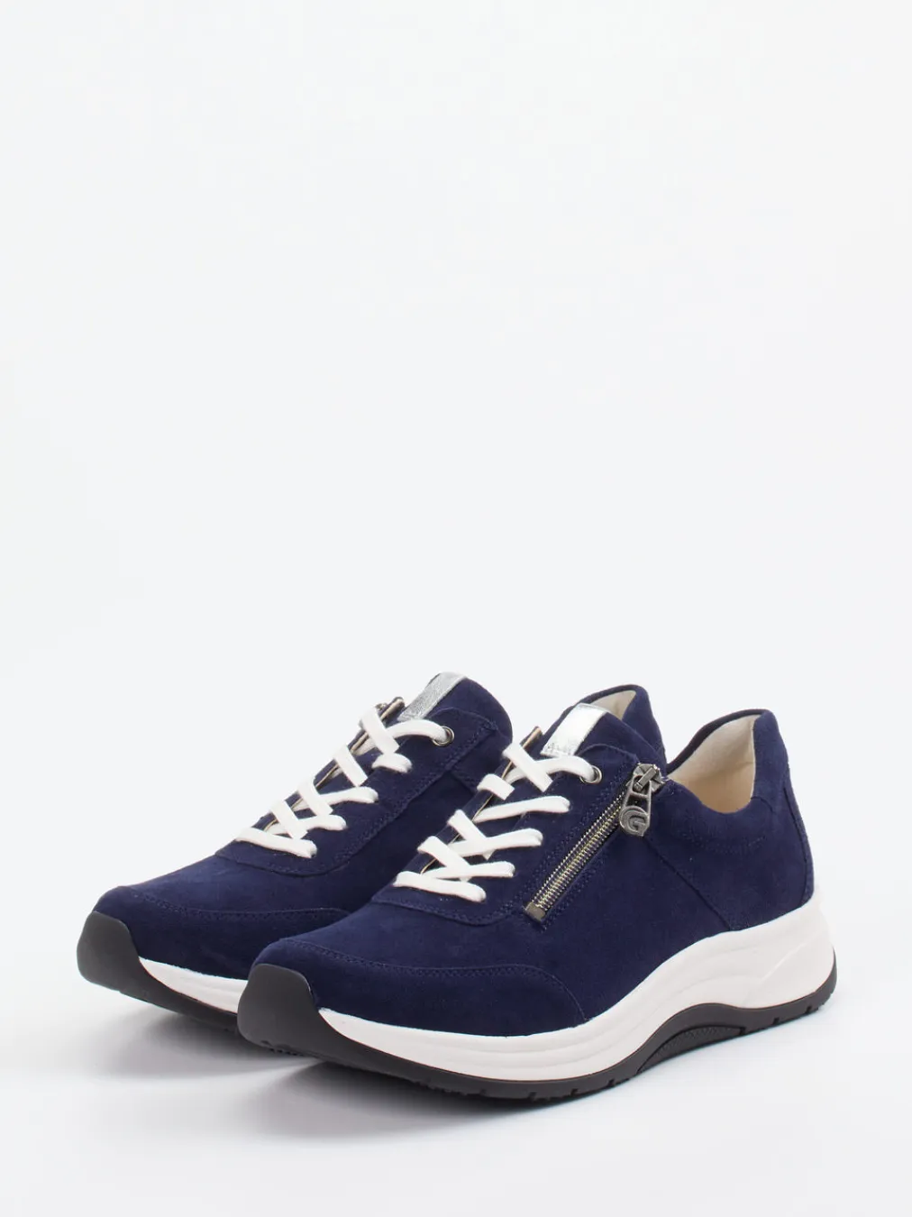 Minimalismus trifft Tragkomfort.Ganter präsentiert einen Damen-Komfort-Sneaker aus hochwertigem Veloursleder. Für entspannte Alltagseinsätze zeigt sich das dunkelblaue Modell als wohltuend leicht und bequem. Das samtig angeschliffene Veloursleder verleiht ihm eine matte, ruhige Ästhetik. Weiß abgesetzte Schnürung und ein seitlicher Reißverschluss erleichtern das Anziehen und setzen klare Akzente. Die Gummisohle mit ergonomischem 4-Punkt-System federt gelenkschonend ab, während das austauschbare Latexfußbett zusätzlich Komfort verspricht. Dank Weite H, gepolstertem Schaft und Lederfutter eignet sich dieser Sneaker besonders für komfortorientierte Looks im Freizeitbereich. Ein durchdachter Alltagsbegleiter – mit Ganter-typischer Funktionalität und puristischem Stil.