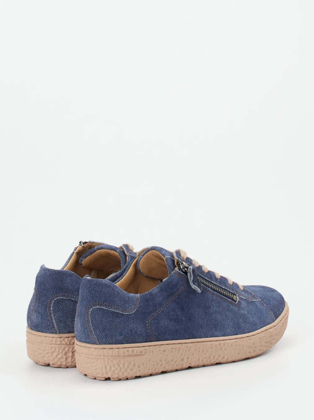 Dieser Sneaker verbindet ein samtiges Veloursleder in Jeansoptik mit hochwertigen Komfortdetails – ideal für entspannte Alltagslooks mit modischem Akzent.