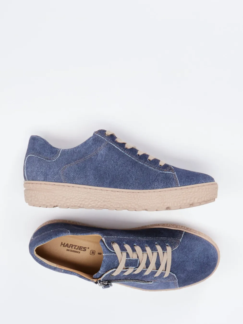 Spürbarer Komfort trifft Denimtrend.Die Marke Hartjes präsentiert mit diesem Komfort-Sneaker ein sportiv-elegantes Damenmodell für Alltag und Freizeit. Die Kombination aus jeansblauem Veloursleder, das eine samtige Haptik vermittelt, und beigen Trendakzenten bringt Leichtigkeit in den Alltag. Die klassische, runde Form wird durch eine moderne Schnürung mit seitlichem Reißverschluss ergänzt, was das An- und Ausziehen erleichtert. Ein Kalbleder-Innenfutter und die gepolsterte Komfortsohle bieten ausgezeichneten Tragekomfort, während die beige strukturierte Gummisohle für Trittsicherheit sorgt. Inspiriert vom Denim Revival der Saison, ist dieser Schuh perfekt für Casual-Looks mit Utility-Charakter. Hartjes vereint bei diesem Modell Funktionalität und Stilsicherheit in komfortabler Weite H.