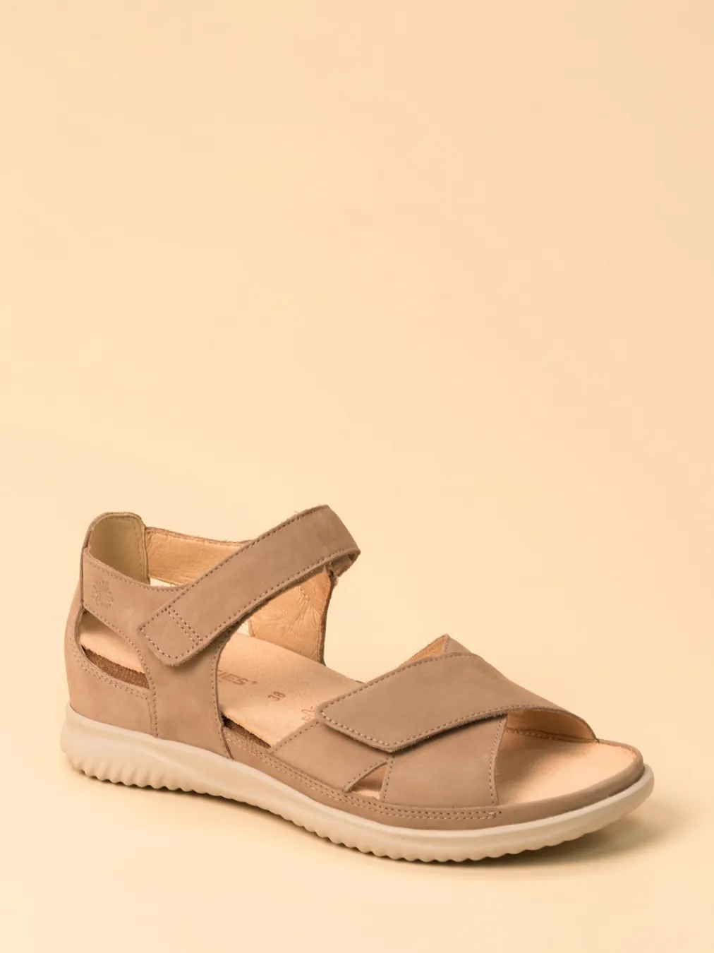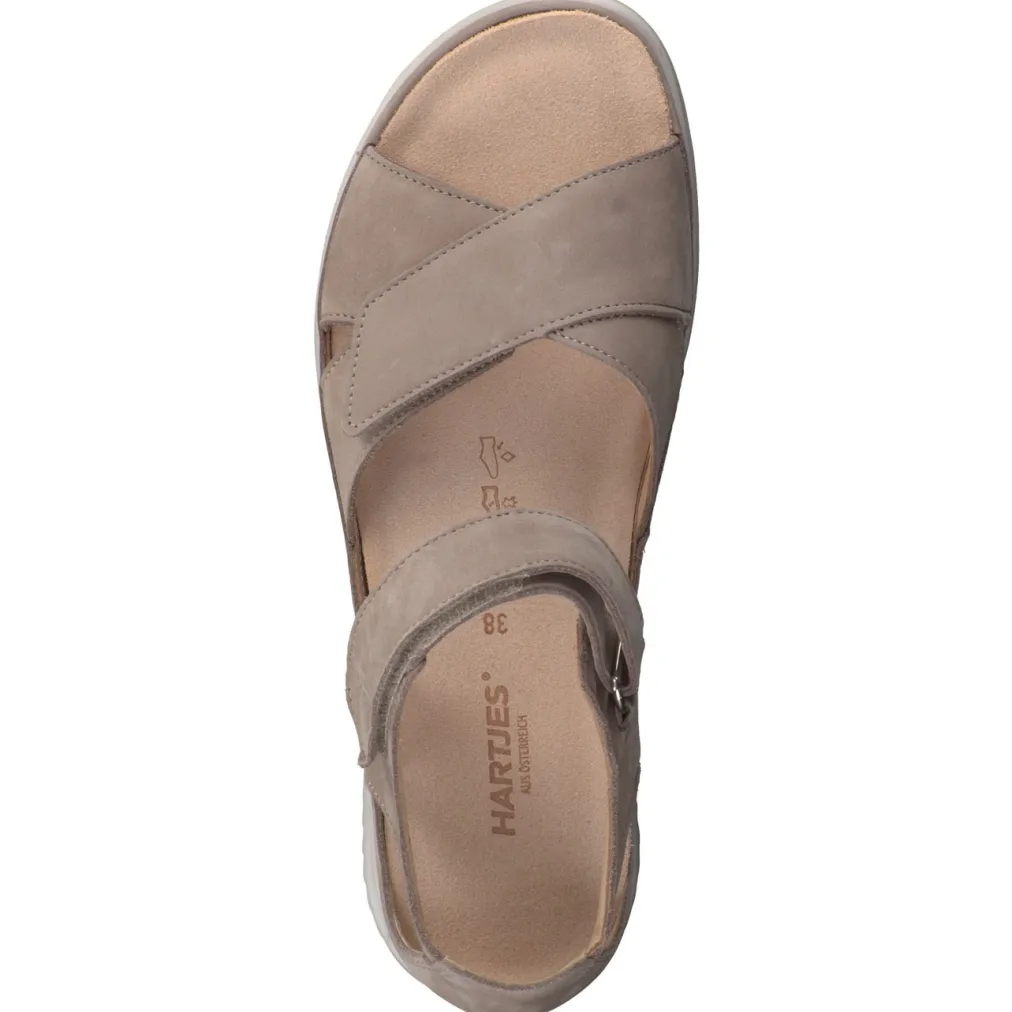 Minimale Form, maximaler Komfort.Die Marke Hartjes präsentiert mit dieser Komfortsandale ein alltagsstarkes Damenmodell für warme Tage. Ob beim Stadtbummel oder beim Relaxen im Garten: Das samtig angeschliffene Nubukleder in elegantem Beigegrau und die ergonomisch geformte Silhouette sorgen für ein natürliches Tragegefühl. Tonige Nähte, die weich gepolsterte Fersenpartie sowie individuell verstellbare Klettverschlüsse bieten funktionale Details mit Stil. Das lederbezogene Fußbett ist herausnehmbar – ideal bei Bedarf nach eigenen Einlagen. Die flexible, profilierte Gummisohle sorgt für sicheren Stand. Ein vielseitiger Alltagsbegleiter im Zeichen kompromisslosen Komforts von Hartjes.