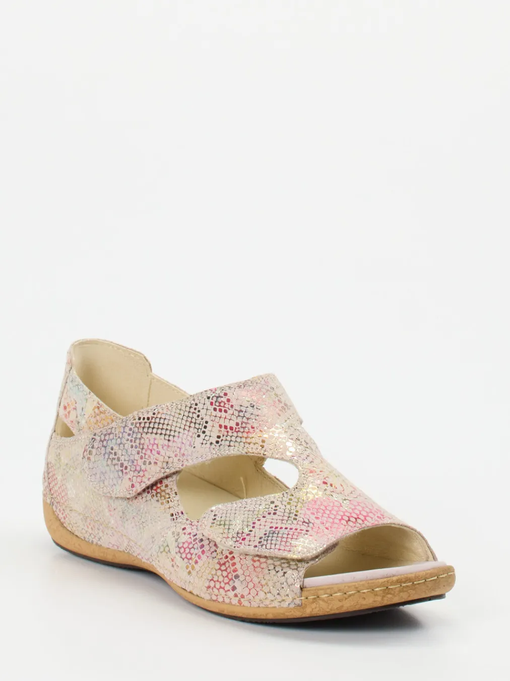 Schimmernde Leichtigkeit für den Sommer.Waldläufer präsentiert mit dieser Damen-Komfortsandale einen stilvollen Alltagsbegleiter. Ob beim Stadtbummel oder auf Urlaubswegen – das geprägte Leder mit glänzender Schlangenstruktur in Rosé-Beige und Hellrosa verleiht der Sandale einen femininen Akzent. Zwei praktische Klettverschlüsse und die geschlossene Ferse bieten Stabilität, während die gepolsterte Innensohle in Kombination mit der Weite H besonders hohen Tragekomfort garantiert. Cut-Outs belüften den Fuß angenehm an warmen Tagen. Der schimmernde Metallic-Effekt greift aktuelle Pastell- und Glanztrends auf. Kombiniert sich ideal zu leichten Sommerhosen. Komfort auf höchstem Niveau – typisch Waldläufer.