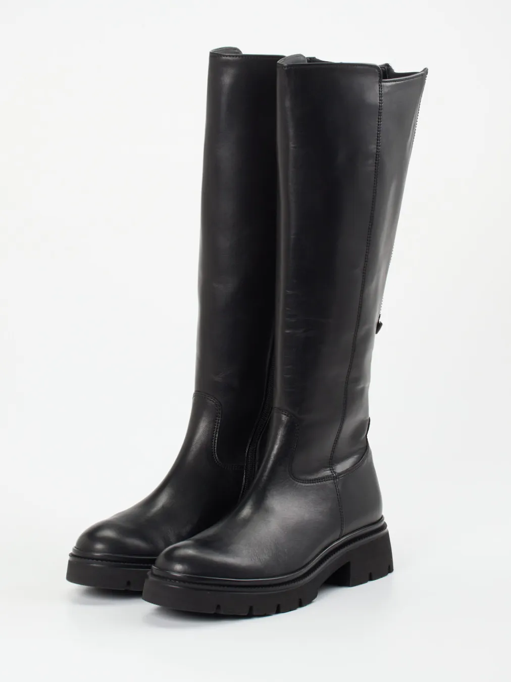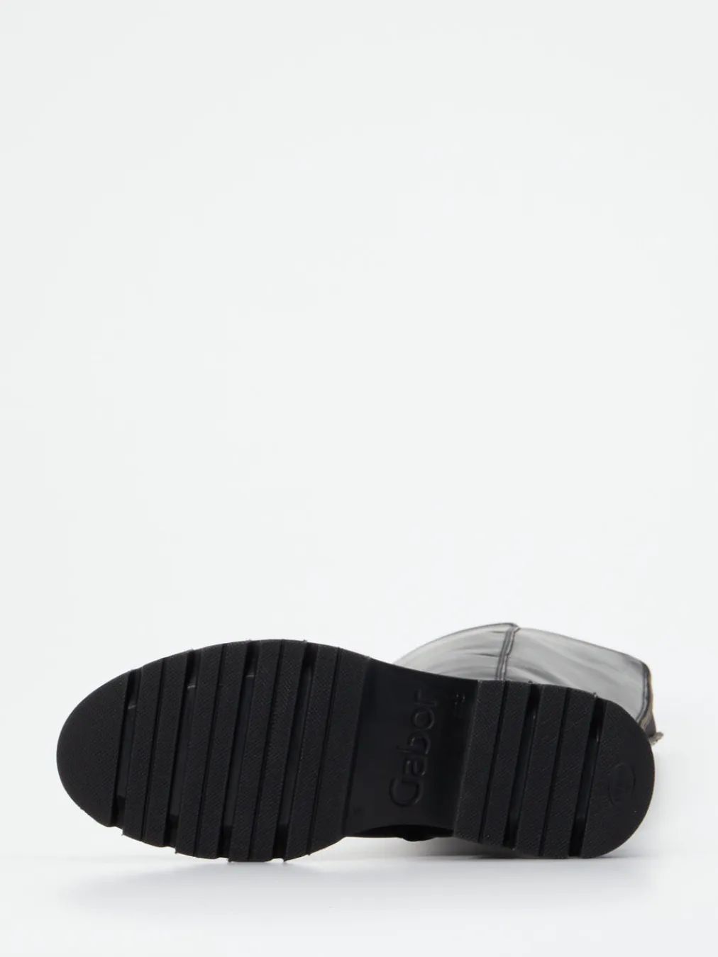Dieser kniehohe Damenstiefel von Gabor kombiniert hochwertiges schwarzes Glattleder mit einer modernen Chunky-Sohle – ein minimalistisches Design mit funktionalem Reißverschluss am Schaft.
