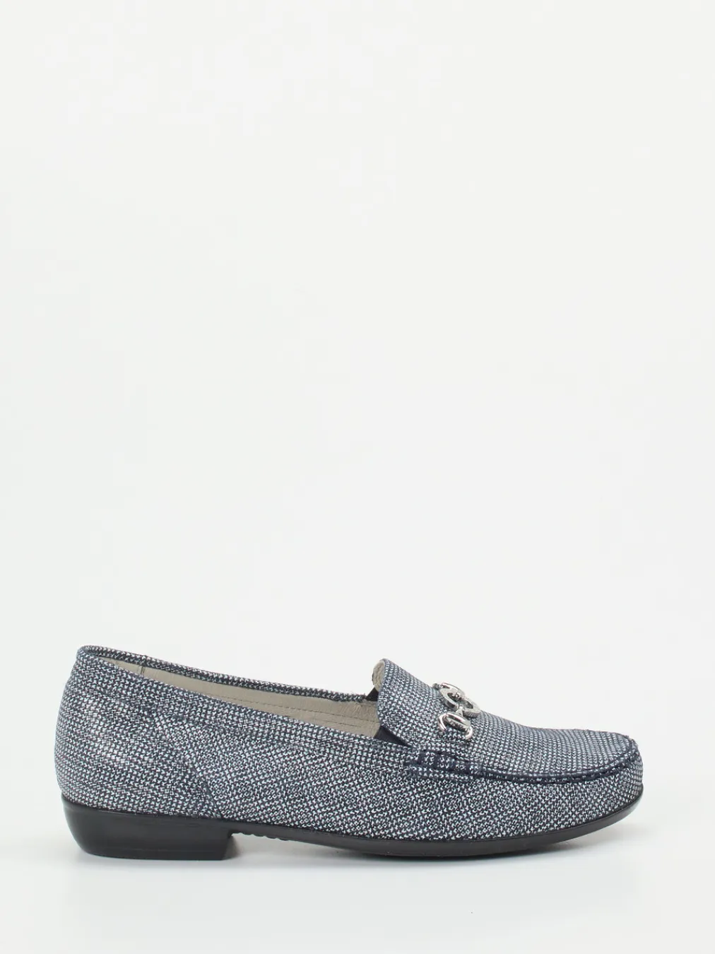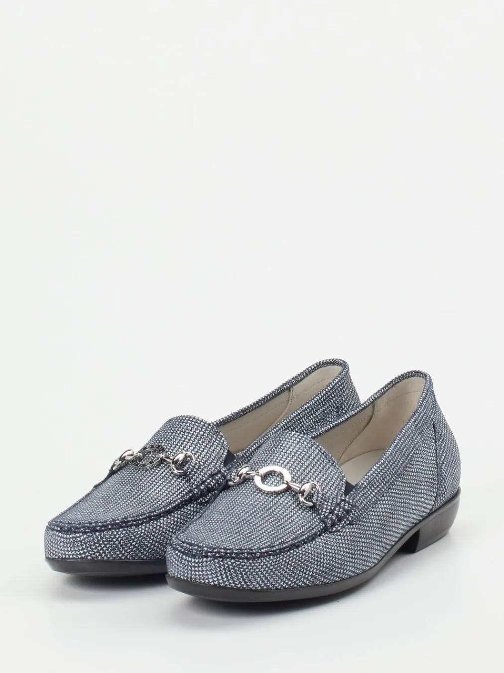 Komfort trifft strukturierte Eleganz.Der Damen-Loafer von Waldläufer verbindet Preppy-Stil mit modernem Komfort. Für lange Büro- oder Alltagseinsätze bietet der Slipper dank geprägtem Leder in meliertem Jeansblau mit ergonomischem Fußbett ermüdungsfreies Tragen. Die klassische Schlupfform mit flacher Silhouette erlaubt leichten Einstieg, während eine silberfarbene Zierspange und sportive Mokassinnaht dezente Akzente setzen. Die rutschhemmende Gummisohle und austauschbares Fußbett unterstreichen Funktion und Vielseitigkeit dieses Modells. Als Trendpiece passt der Loafer ideal zur Textur-Mix-Mode der Saison und ergänzt gedeckte Töne oder Denim-Styles souverän. Authentischer Waldläufer-Komfort in souveränem Preppy-Design.