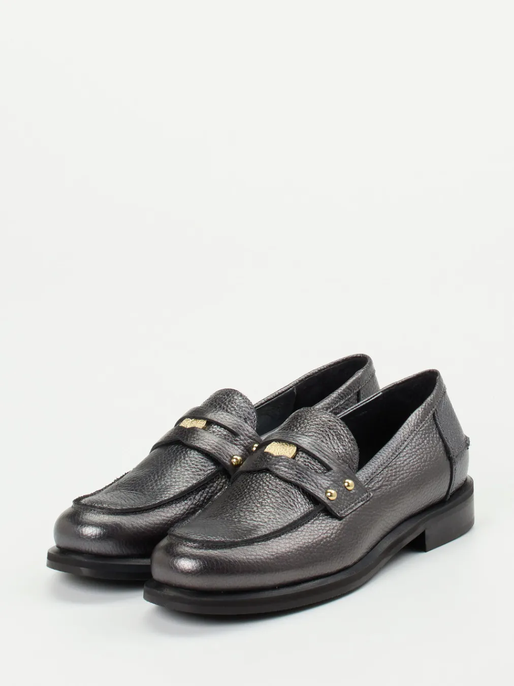 Für Tage, an denen Komfort und Stil gleichermaßen gefragt sind, bietet dieser Schuh mit seinem samtig genarbten Kalbleder in graphitgrauem Metallic-Finish eine ideale Lösung. Die flache Silhouette, ein flacher Blockabsatz und der Schlupfeinstieg betonen seine Alltagstauglichkeit. Den Retro-Charme eines Penny Loafers greift die geschlitzte Spange mit eingelegter Ziermünze gekonnt auf. Goldfarbene Metalldetails greifen den Metallic-Trend auf und verleihen dem Modell einen spannenden Twist. Harmoniert hervorragend mit schmalen Stoffhosen oder Blazern für ein stilvolles Büro-Outfit.