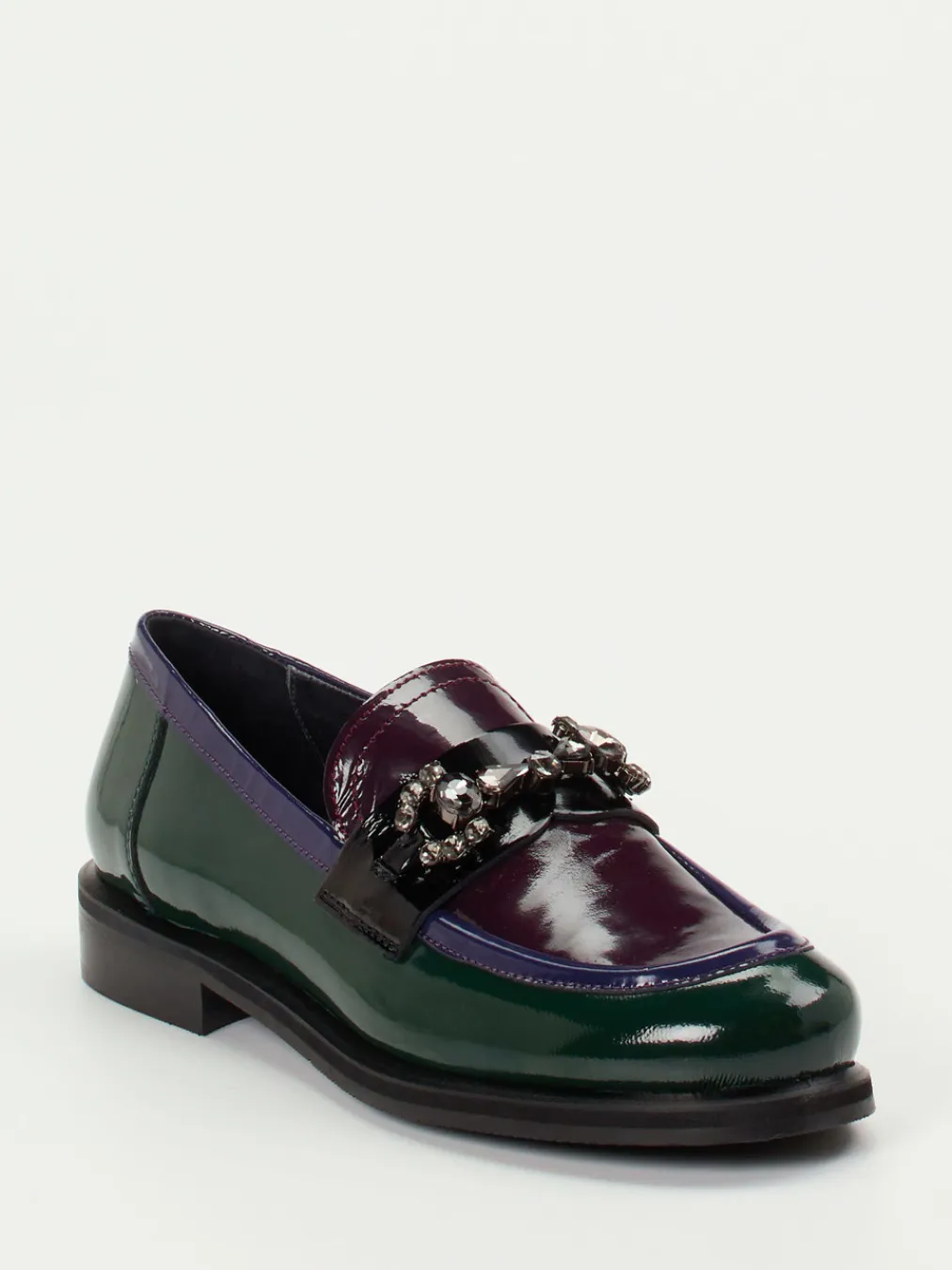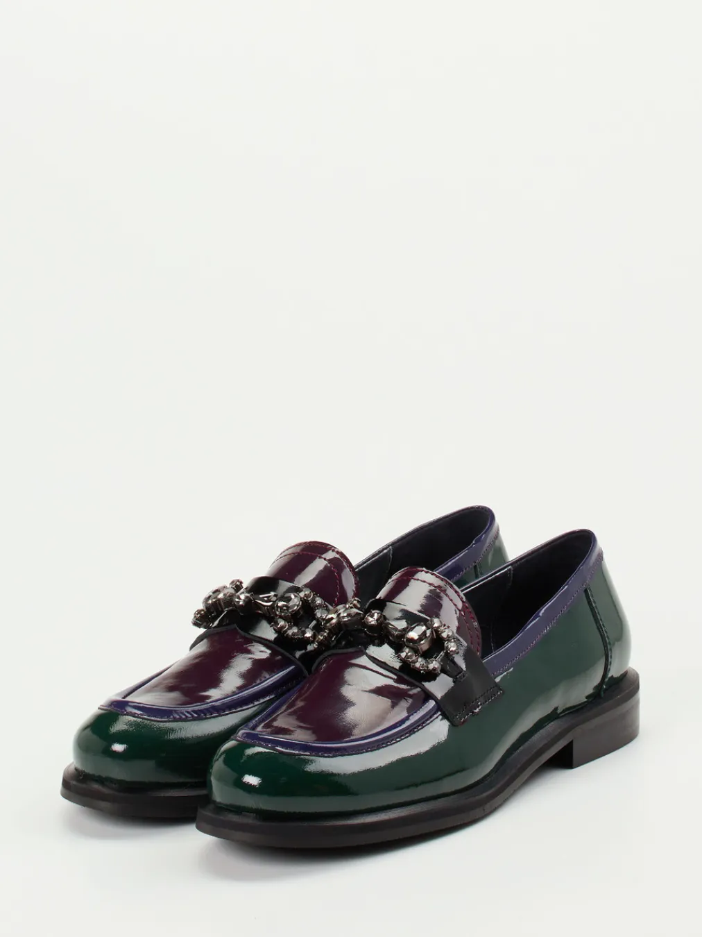 Ideal für modische City-Tage oder abendliche Events überzeugt das Modell mit flaschengrünem Color-Blocking, maulbeerfarbenen Akzenten und einer kontrastierenden Mokassinnaht in Violett. Hochwertiges Lackleder trifft auf eine klassische Silhouette in Schlupfform, ergänzt durch eine schwarze Zierspange mit rauchfarbenen Glitzersteinen. Die strukturierte Gummisohle samt Blockabsatz sorgt für ein stabiles Tragegefühl, das Innenfutter aus Kalbleder mit gepolstertem Fußbett für angenehme Bequemlichkeit. Gekonnt inspiriert von 90er-Jahre-Vibes und dem Herbsttrend Statement-Loafer lässt sich das Modell ideal zu minimalistischen Kleidern oder glänzenden Accessoires stylen.