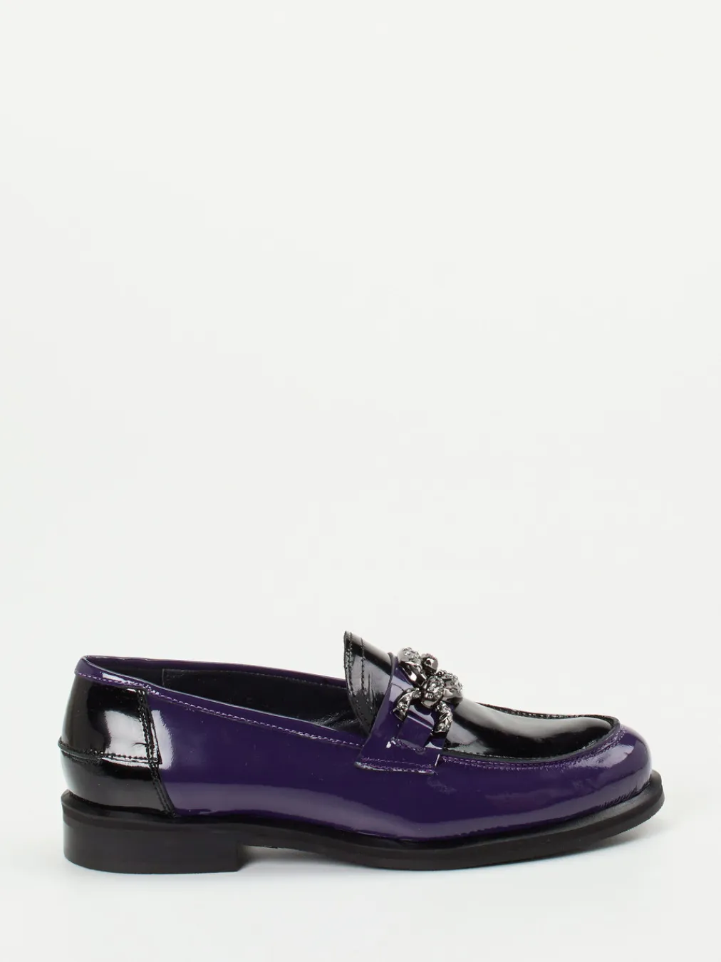 Ideal für den Übergang vom Büro ins Abendprogramm: Der in Violett und Schwarz gehaltene Damenschuh aus glänzendem Lackleder begeistert mit flacher Silhouette und einer auffälligen, silberfarbenen Gliederkette inklusive funkelnder Schmucksteine. Kalblederfutter und weich gepolstertes Fußbett sorgen innen für Komfort, während die profilierte Gummisohle rutschhemmende Eigenschaften bietet. Stilistisch knüpft das Modell an das Y2K-Revival an und lässt sich mit farblich abgestimmter Crossbody-Bag oder Blazer kombinieren.