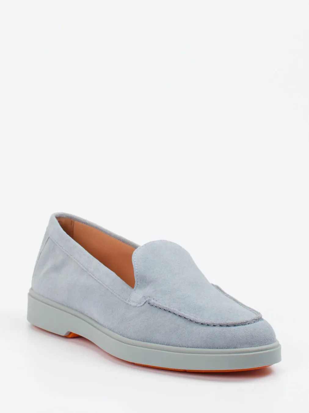 Leichtigkeit trifft Designklarheit.Santoni präsentiert mit diesem Herren-Loafer ein stilvolles Modell für Smart-Casual-Outfits der wärmeren Monate. Ideal für Alltag und Büro überzeugt der Schuh mit weichem Veloursleder, samtig angeschliffen, in einem eleganten Eisblau. Ton-in-Ton-Nähte unterstreichen die klassische Silhouette, während die durchgehende Gummisohle mit orangefarbenem Profil einen spannenden Kontrast setzt. Die gepolsterte Ferse und das Lammnappa-Futter sorgen für hohen Komfort. Im Kontext aktueller Trends wie Quiet Luxury und Soft Tones positioniert sich der Loafer souverän minimalistisch. Lässt sich ideal mit Chinos oder hellen Stoffhosen kombinieren. Ein eleganter Begleiter mit italienischer Handwerksästhetik und subtiler Raffinesse.