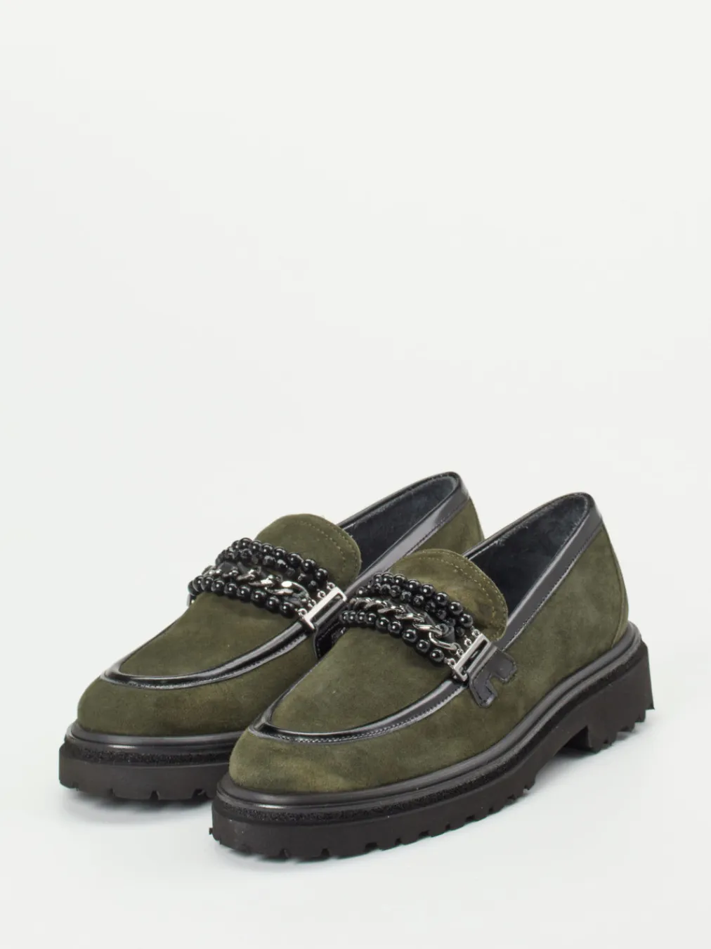 Statement in Olivgrün.Maripé interpretiert den klassischen Damen-Loafer mit einem modernen Look. Für einen stilvollen Übergang vom Büro in die City bietet dieser Loafer aus samtig angeschliffenem Veloursleder in tiefem Olivgrün das perfekte Stilmittel. Die glänzende, schwarze Gliederkette mit Perlen setzt ein markantes Statement, während die profilierte Leichtzellsohle mit 3 cm Absatz urbanen Komfort garantiert. Der Schlupfschuh kombiniert Minimalismus mit herbstlicher Streetwear-Ästhetik. Innen sorgt Kalblederfutter mit silberner Metallic-Note für gehobenen Tragekomfort. Trendstück mit eigenständiger Eleganz – typisch Maripé.