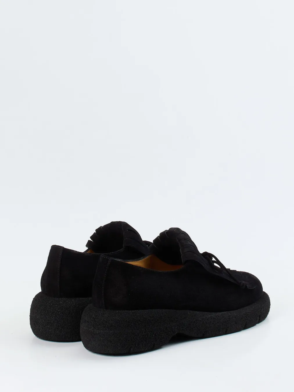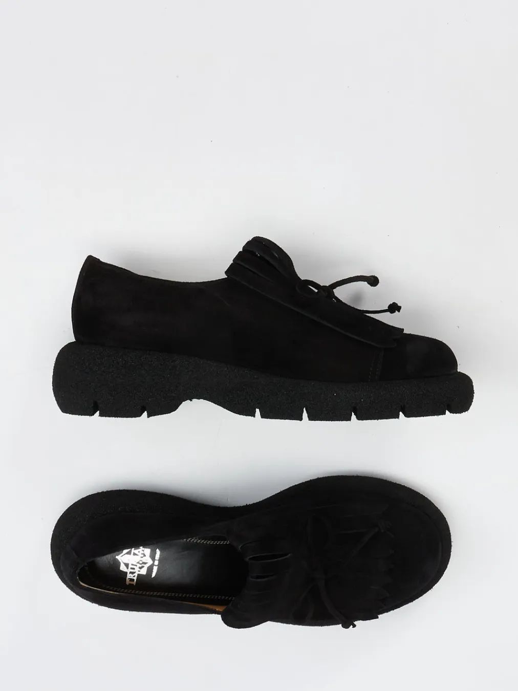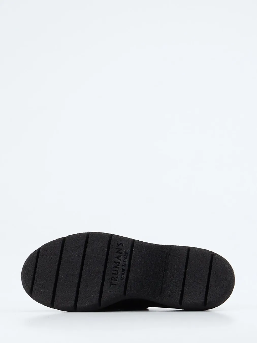 Markanter Minimalismus trifft Retro-Flair.Der Damen-Loafer von Truman’s vereint traditionelle Elemente mit modernem Zeitgeist. Perfekt für stilvolle Großstadtmomente: Das tiefschwarze Veloursleder zeigt sich samtig-matt und wird durch Fransenlasche mit toniger Zierschleife akzentuiert. Die charakteristische Chunky-Sohle in Kombination mit der bequemen Weichbettung sorgt für modischen Ausdruck und angenehmen Komfort. Schlupfform, klassische Silhouette und das puristische Farbkonzept greifen den Trend zur „Quiet Luxury“-Ästhetik auf. Besonders gut kombinierbar mit weiten Stoffhosen oder Oversized-Blazern. Designqualität trifft Alltagstauglichkeit – ein Schuh für moderne Ästhetinnen.