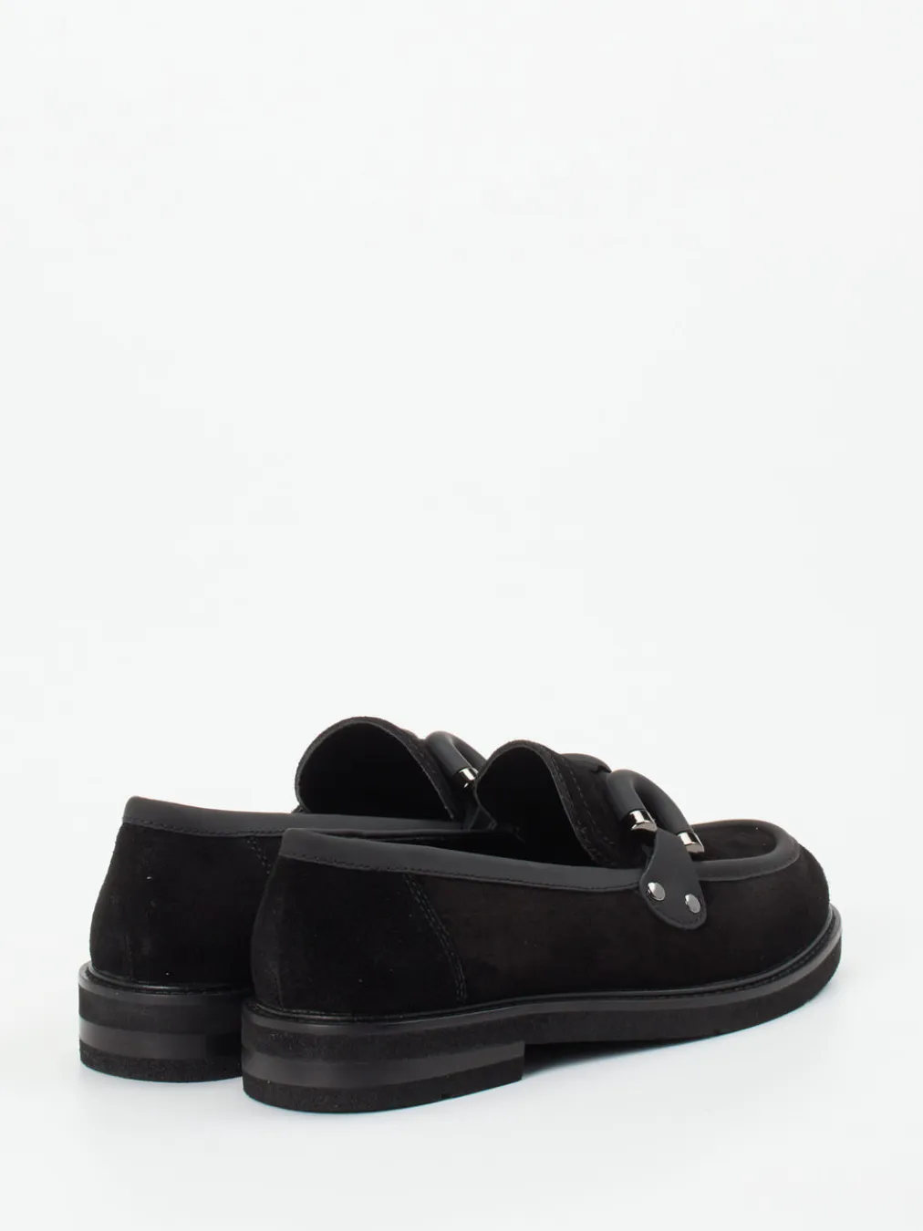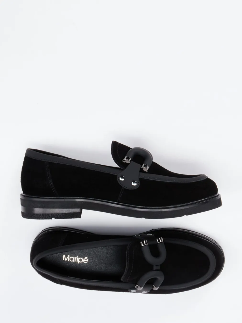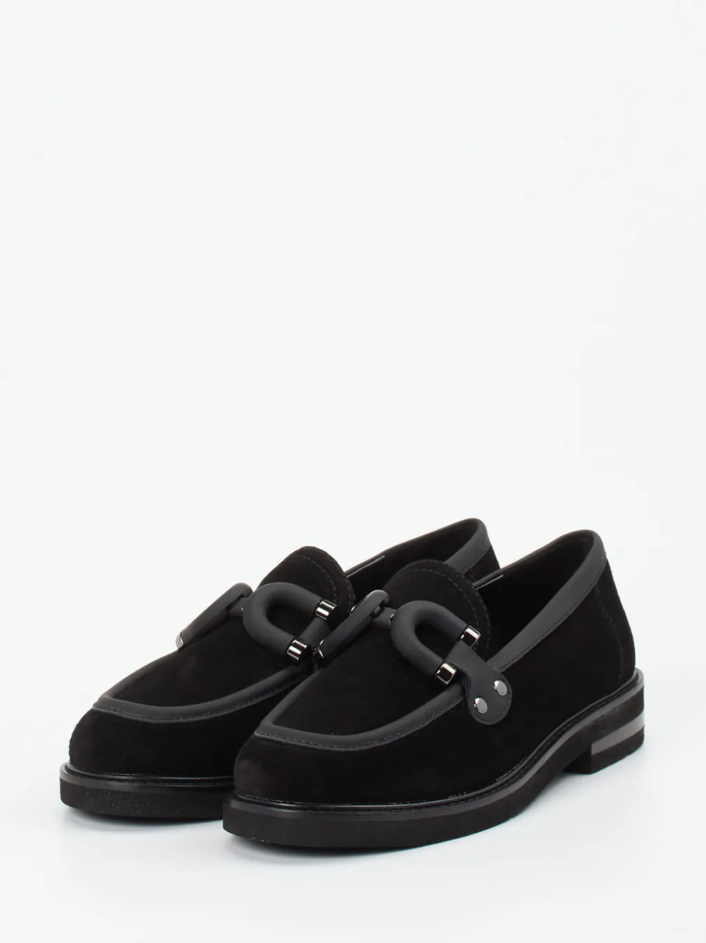 Eleganter Damen-Loafer aus sattschwarzem Veloursleder mit matter Zierspange – ideal für moderne Business- und Freizeit-Outfits im Zeichen des Quiet Luxury.