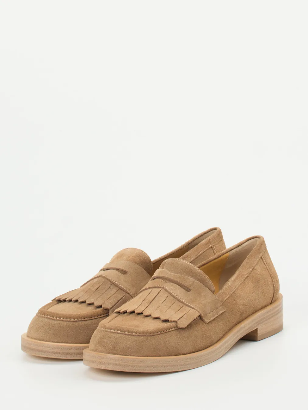 Klassisch und mit modischem Twist: Dieser Loafer aus sandbeigem Veloursleder überzeugt mit Fransenlasche, Stegspange und weichem Lammnappafutter.
