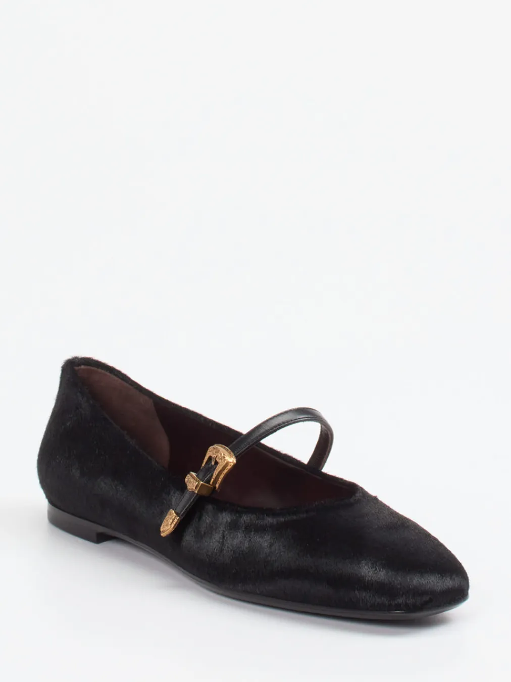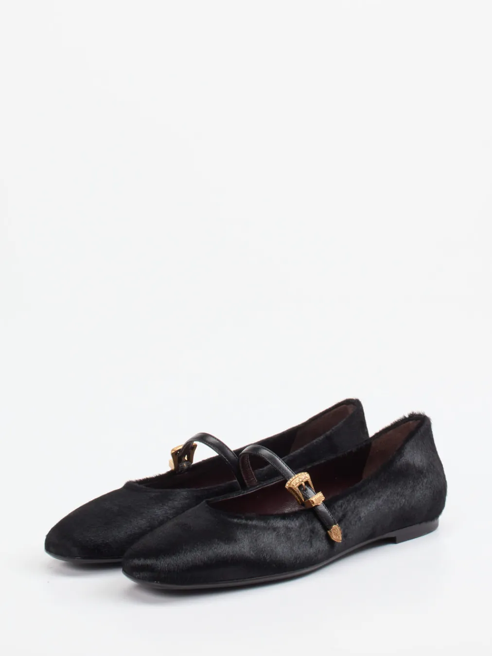 Die klare Silhouette und das strukturierte Obermaterial aus Fell verleihen diesen Mary Jane Ballerinas eine elegante Noblesse mit modernem Vintage-Flair.