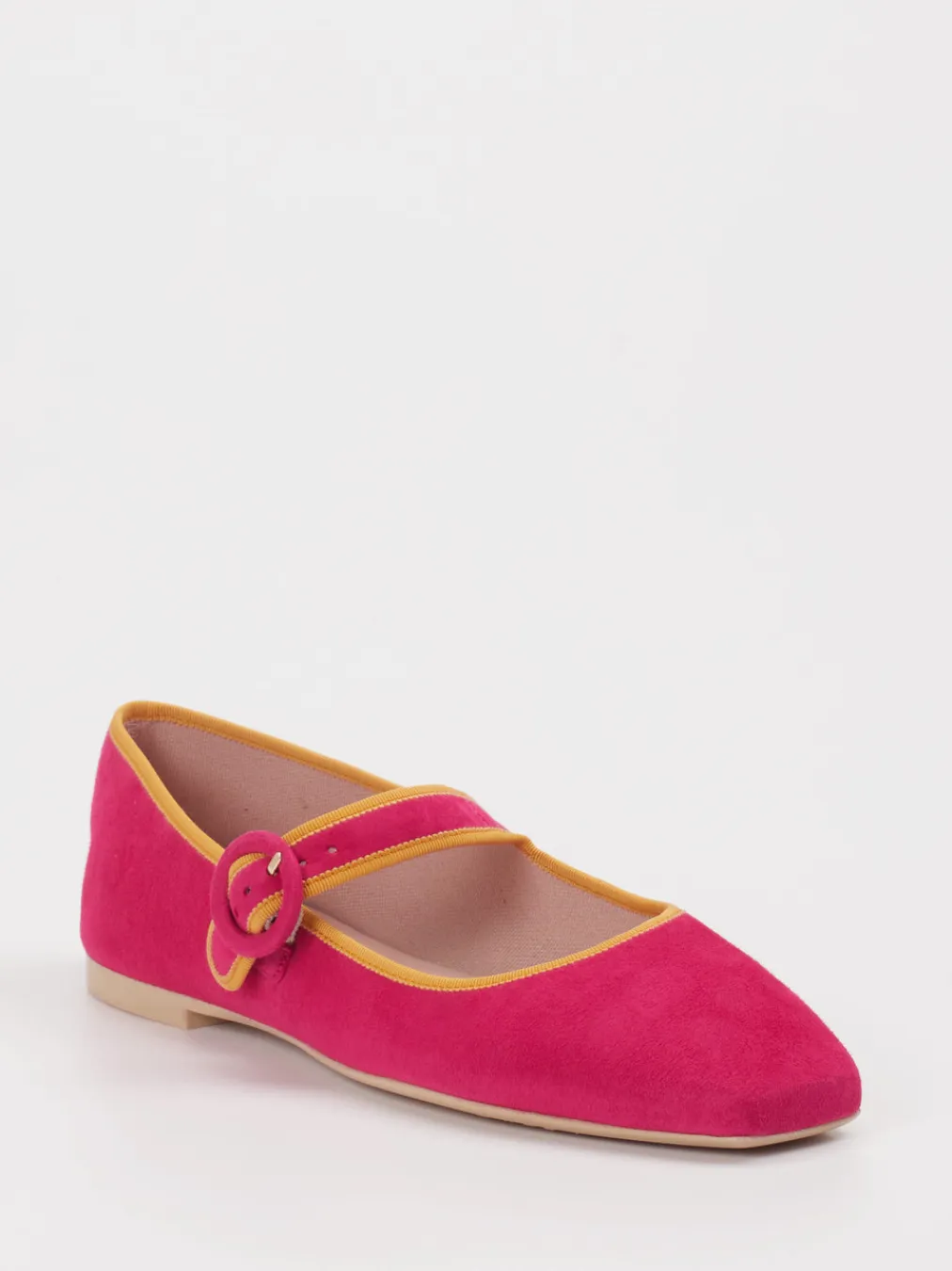 Farbstarkes Update eines Klassikers. Pretty Ballerinas zeigt mit diesen Mary-Jane-Ballerinas ein Damenmodell, das Retro-Flair gekonnt in Szene setzt. Ideal für sommerliche Freizeit- oder Ausgehmomente bringt das Modell Farbe und Charakter in urbane Stylings. Das Obermaterial aus Veloursleder in knalligem Pink wird durch eine senfgelbe Paspelierung sowie eine überzogene Schnalle effektvoll akzentuiert. Die klassische flache Silhouette mit Riemenverschluss verleiht dem Design einen preppy Touch. Die glatte Gummisohle sorgt für angenehmen Tragekomfort. Perfekt zum Color-Blocking-Trend und kombiniert mit femininem Sommerrock oder Mini-Bag ein echter Eyecatcher. Markentypisches Detailbewusstsein trifft auf modische Signalstärke.