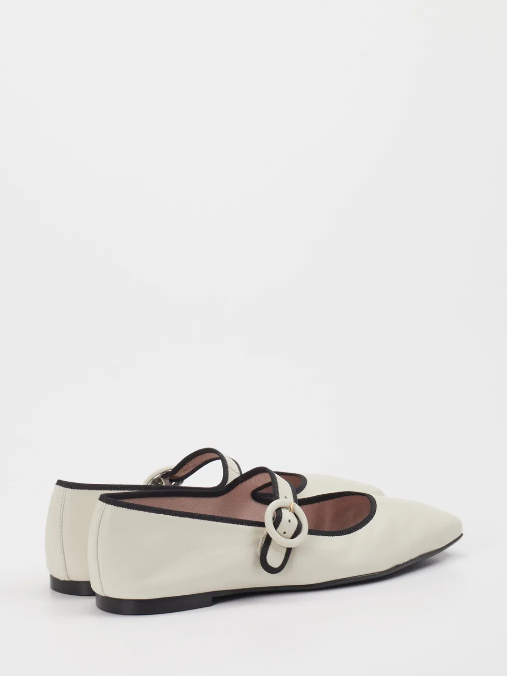 Die klassischen Mary Jane Flats überzeugen mit einem eleganten Cremeweiß, schwarzer Paspelierung und einer matten Glattlederoptik – zeitloses Design mit dezentem Retro-Charme.