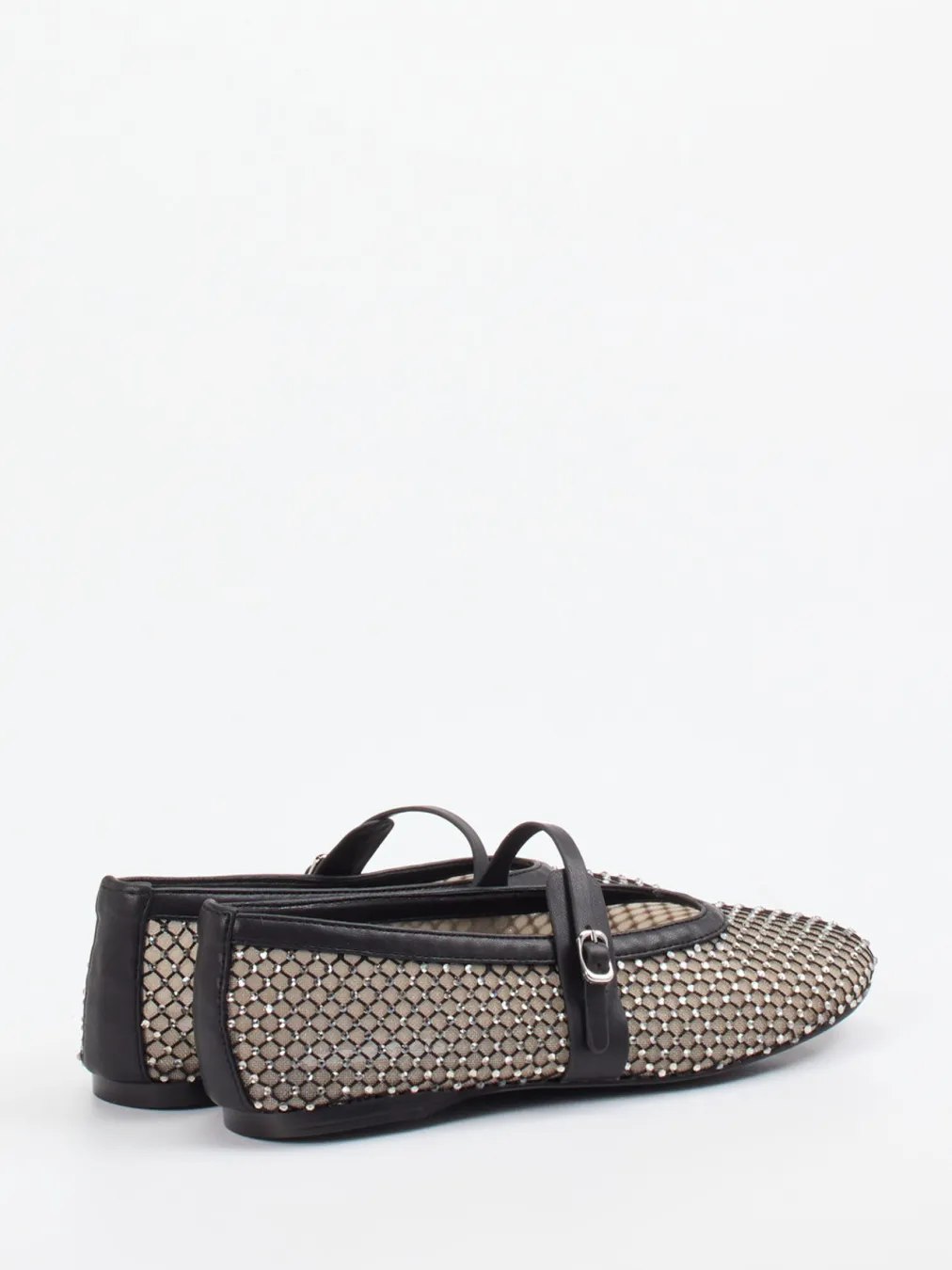 Das Modell verbindet atmungsaktive Netzspitze mit edlem Glanz. Die Strassverzierungen und der klassische Riemen setzen trendige Akzente im Zeichen von Y2K und Balletcore.