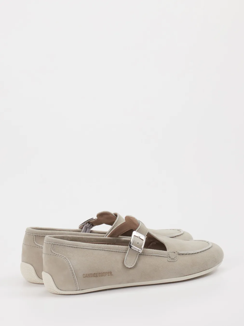 Minimalismus auf den Punkt gebracht. Candice Cooper präsentiert mit diesem Mary-Jane-Halbschuh eine elegante Interpretation des Loafer-Trends. Ideal für Tage, an denen Komfort und Stil gleichermaßen gefragt sind: Das Modell aus Veloursleder zeigt sich in einem matten Beigegrau, dessen Ton-in-Ton-Nähte und silberfarbene Schnalle dezent hervorstechen. Die flache Gummisohle sorgt für angenehmen Laufkomfort, während die sanft abgerundete Form dem Design eine zeitlose Note verleiht. Inspiriert vom Retro-Stil und passend zum Trend „Quiet Luxury“, lässt sich dieser Schuh ideal mit einem leichten Trenchcoat oder einer Handtasche in Taupe kombinieren. Markentypisch vereint dieses Modell subtile Eleganz mit hochwertiger Verarbeitung.
