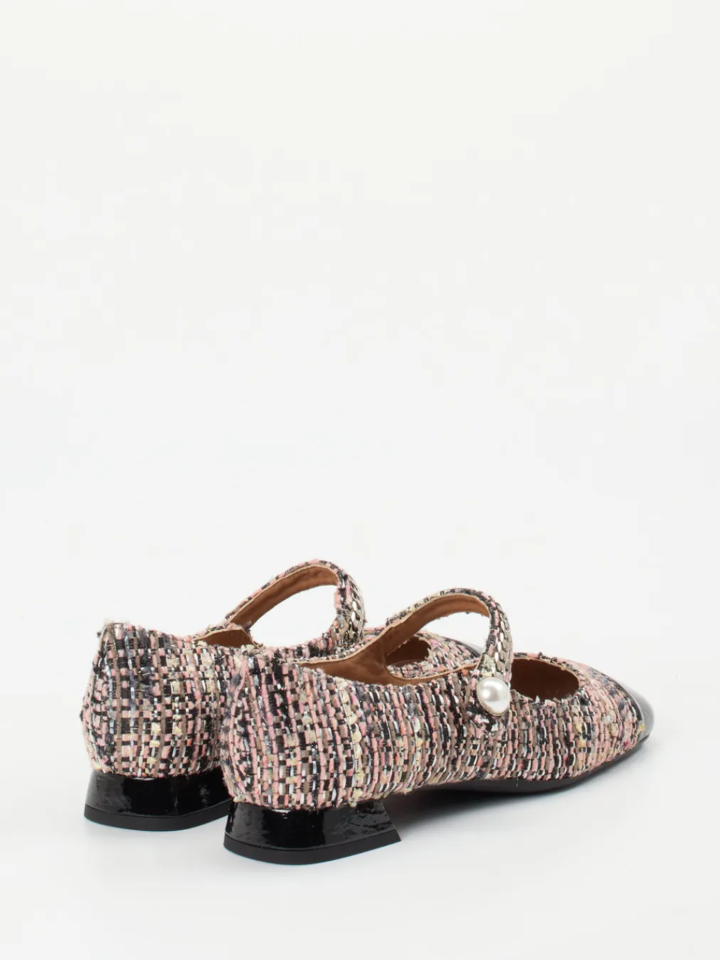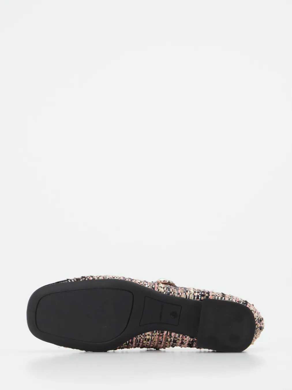 Edler Retro-Charme mit modernen Akzenten.Konstantin Starke interpretiert Mary Janes auf elegante Weise neu. Für formelle Anlässe oder stilvolle Business-Outfits bietet dieser Ballerina mit klassisch-flacher Silhouette eine ausdrucksstarke Basis. Das strukturierte Textilmaterial im Bouclé-Stil wird durch eine schwarze Lackkappe und eine dekorative Perlen-Zierschnalle ergänzt. Der Druckknopfverschluss unter der Perle erhält das elegante Erscheinungsbild. Die gepolsterte Lederinnensohle und Gummisohle sorgen für Komfort, während das Chanel-inspirierte Design modisch punktet. Ideal kombinierbar mit Bouclé-Blazern oder minimalistischen Outfits. Ein femininer Klassiker für anspruchsvolle Stilwelten.