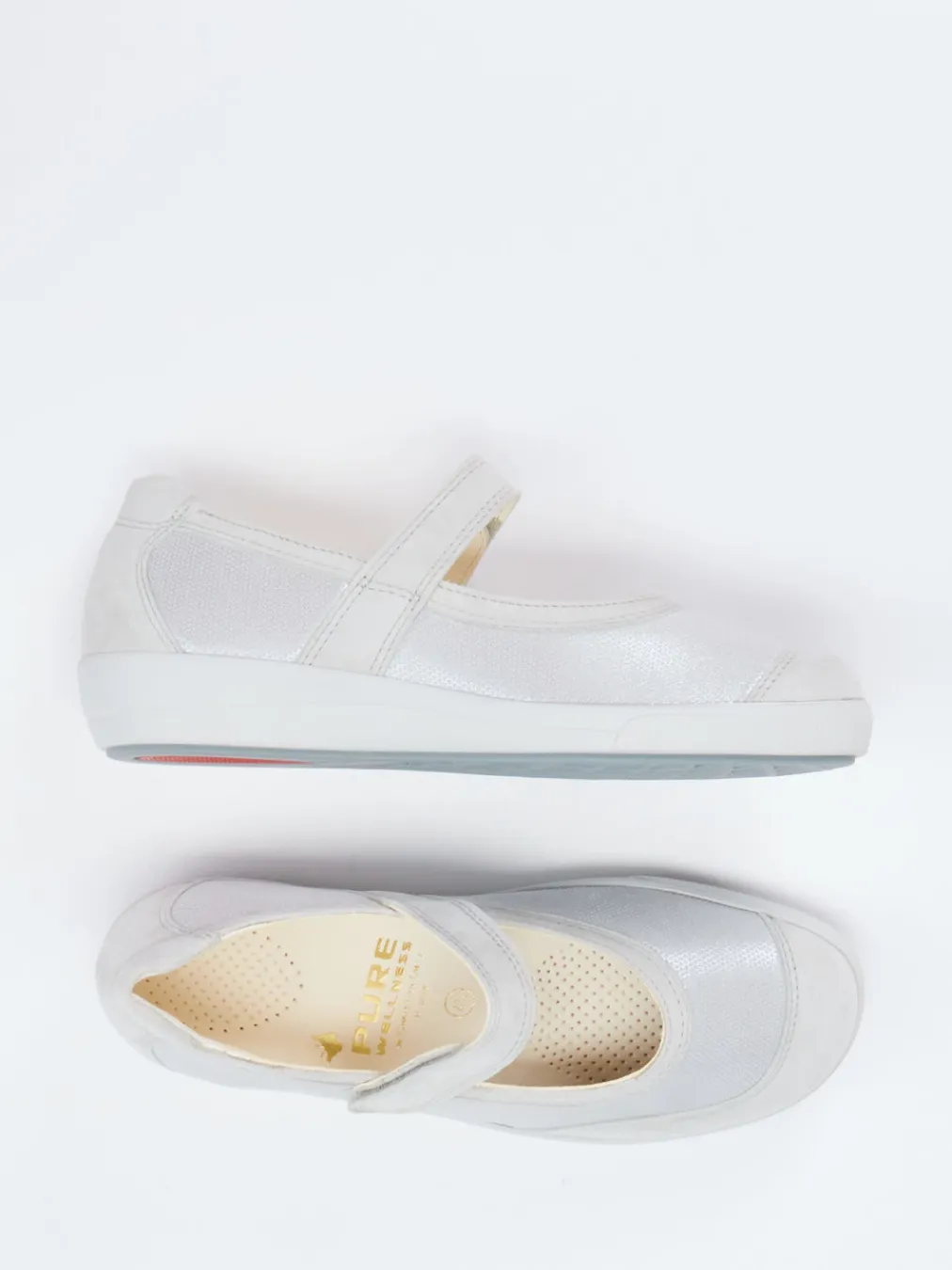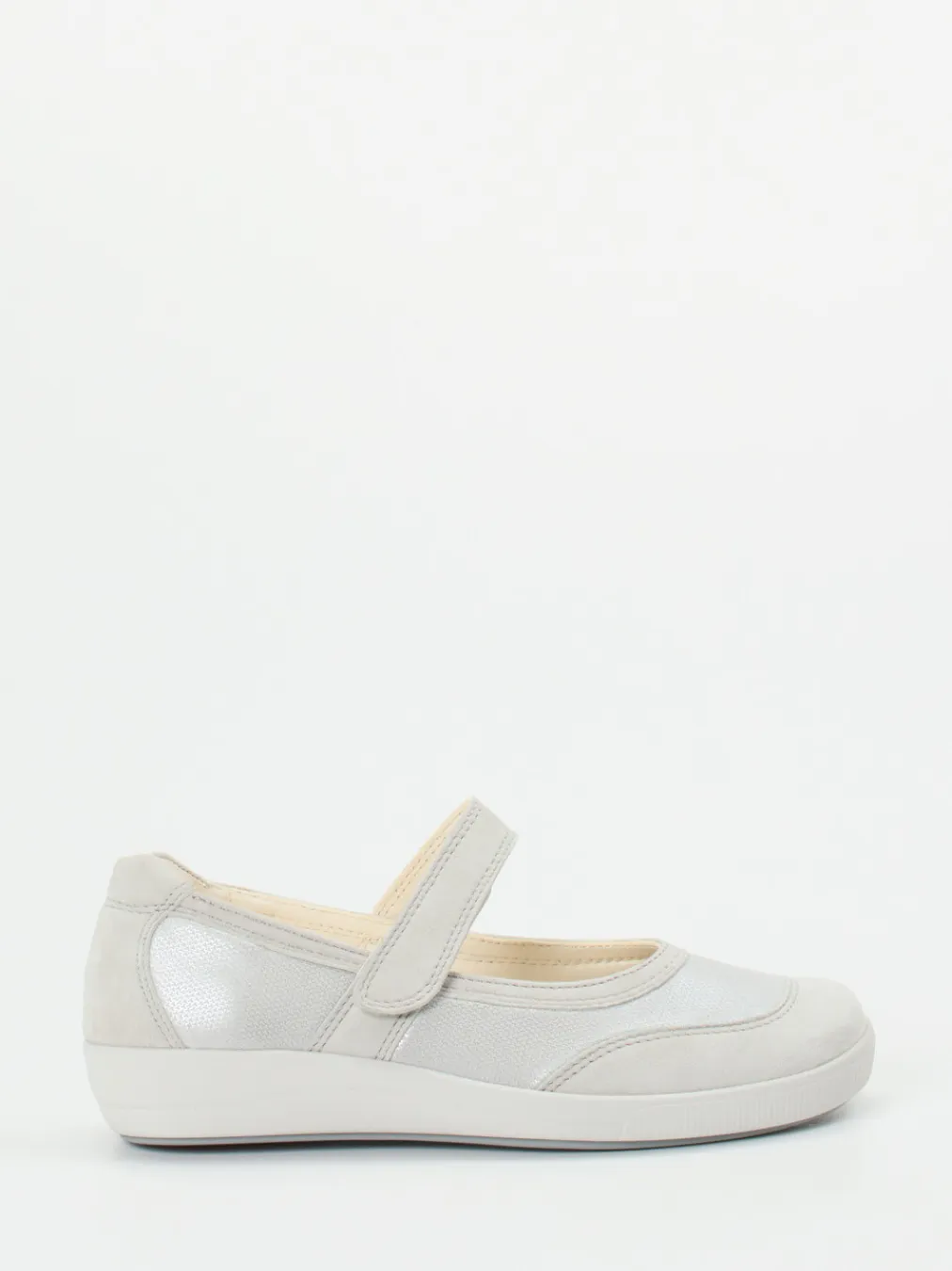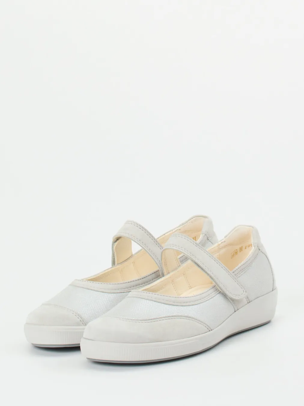 Komfort trifft auf Soft Neutrals.Christian Dietz bietet mit diesen Mary Janes einen bequemen Spangenschuh für Damen. Ob zu Hause oder unterwegs in der Stadt – diese Schuhe verbinden alltagstauglichen Komfort mit dezenten Designakzenten. Das Stretchmaterial in Veloursoptik wird durch hellgraues Kalbleder ergänzt, das mit Ton-in-Ton-Nähten und einem subtilen Schimmer überzeugt. Der Klettverschluss sorgt für eine passgenaue Weitenregulierung, während das ergonomisch geformte, herausnehmbare Korkfußbett Einlagen zulässt. Mit leicht abgerundeter Form, rutschhemmender Gummisohle und gepolsterter Innensohle steht durchdachter Wellness-Komfort im Fokus. Passt ideal zu casual Looks mit Stretch-Jeans oder Cardigan. Christian Dietz verbindet anatomische Passform mit minimalistischer Ästhetik.