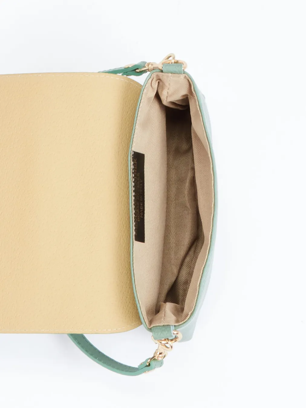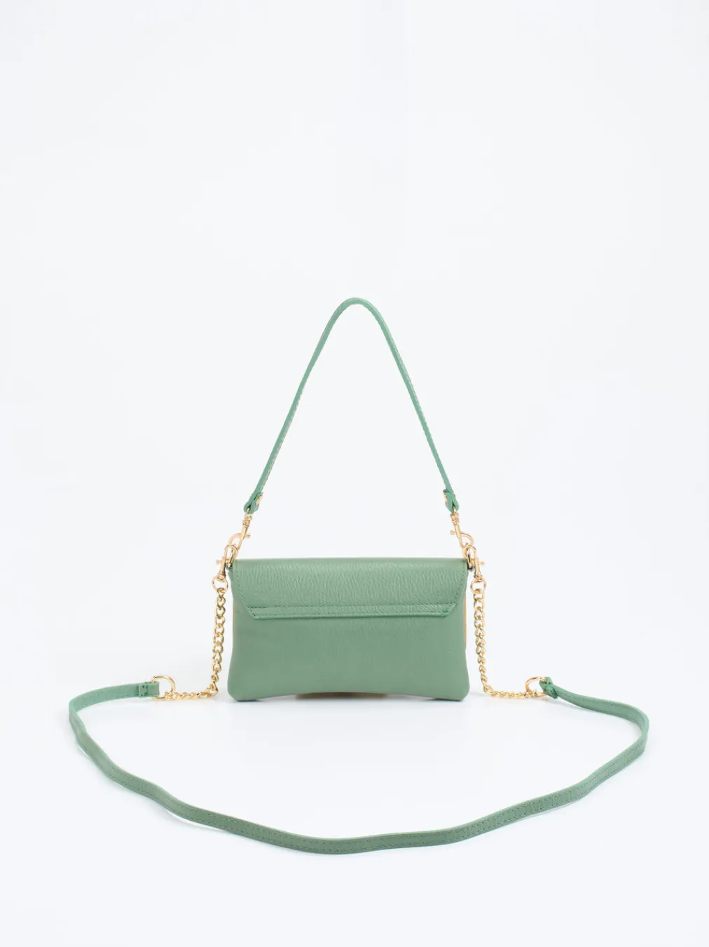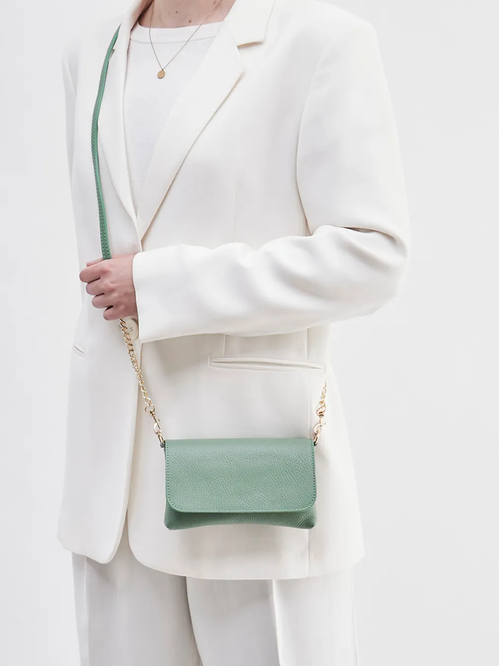 Die salbeigrüne Mini Bag von Marlon Firenze vereint feingenarbtes Kalbleder mit goldfarbener Kettendetailverarbeitung – ein klares Stilbekenntnis für minimalistische Trendlooks.