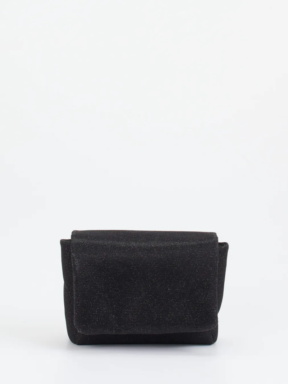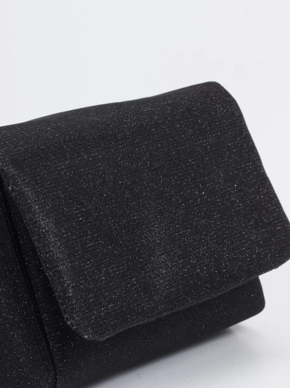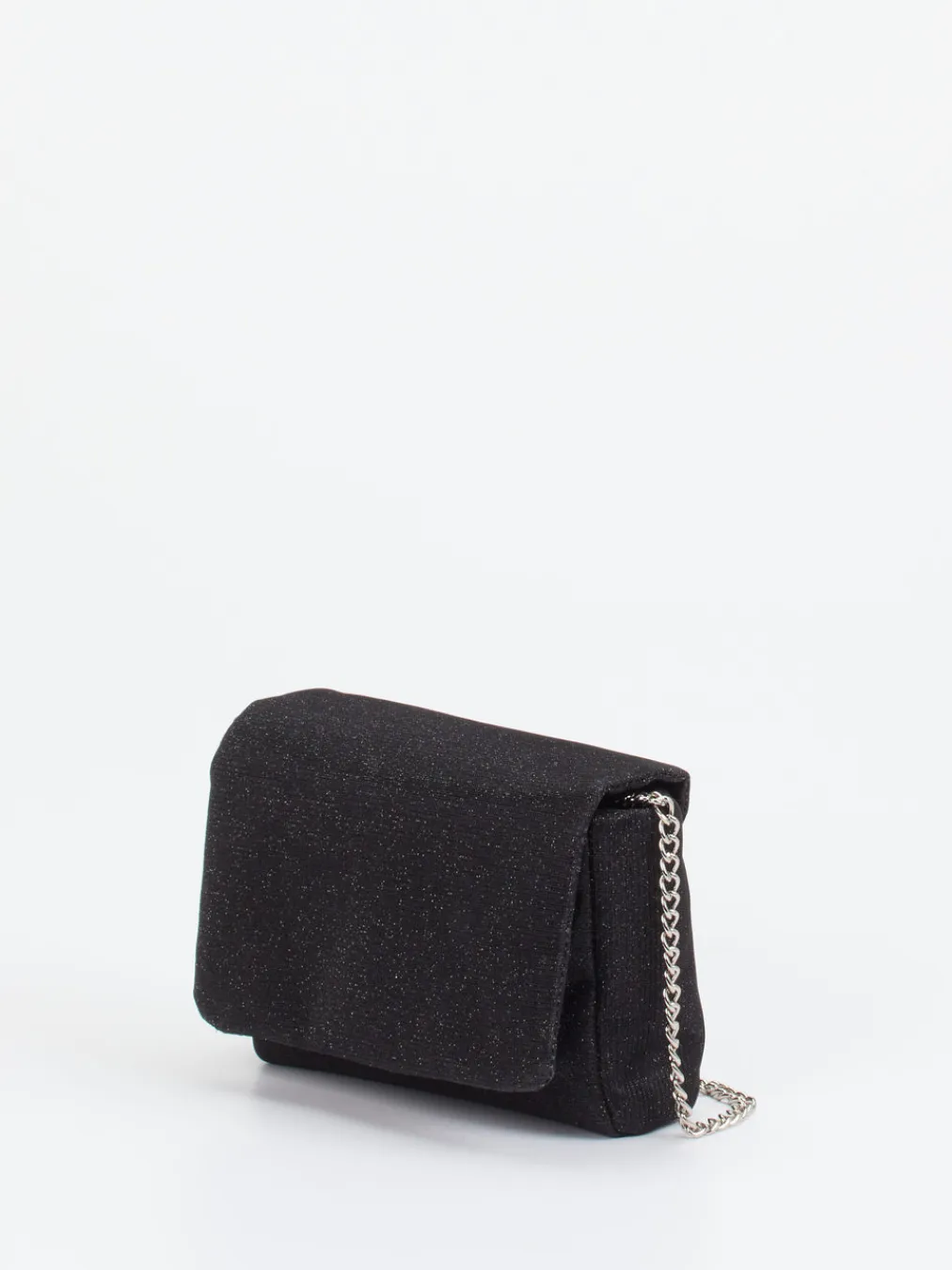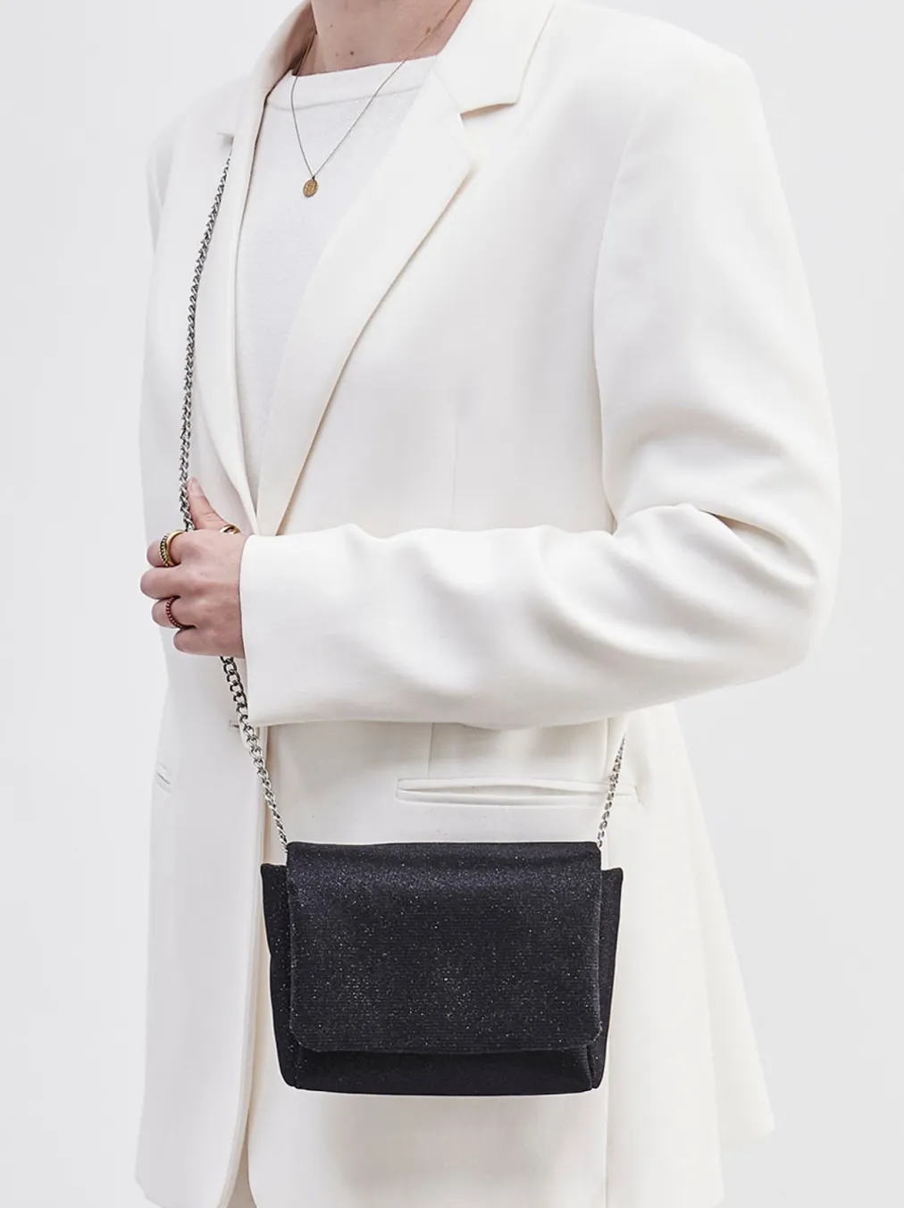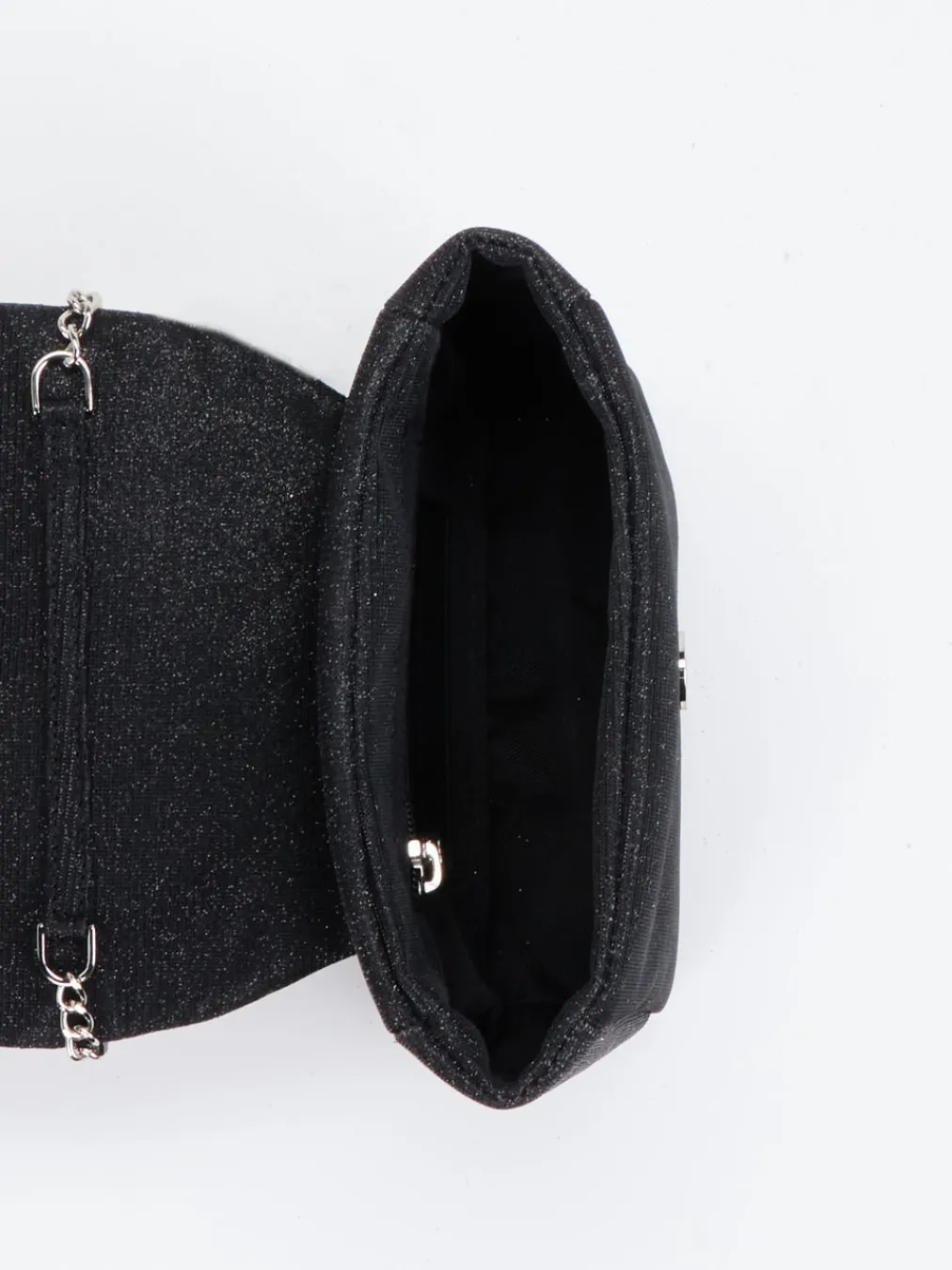 Glanzvoller Auftritt garantiert: Die Mini Bag vereint minimalistisches Design mit glitzerndem Textil und edler Metallkette – perfekt für formelle Anlässe und moderne Abendlooks.