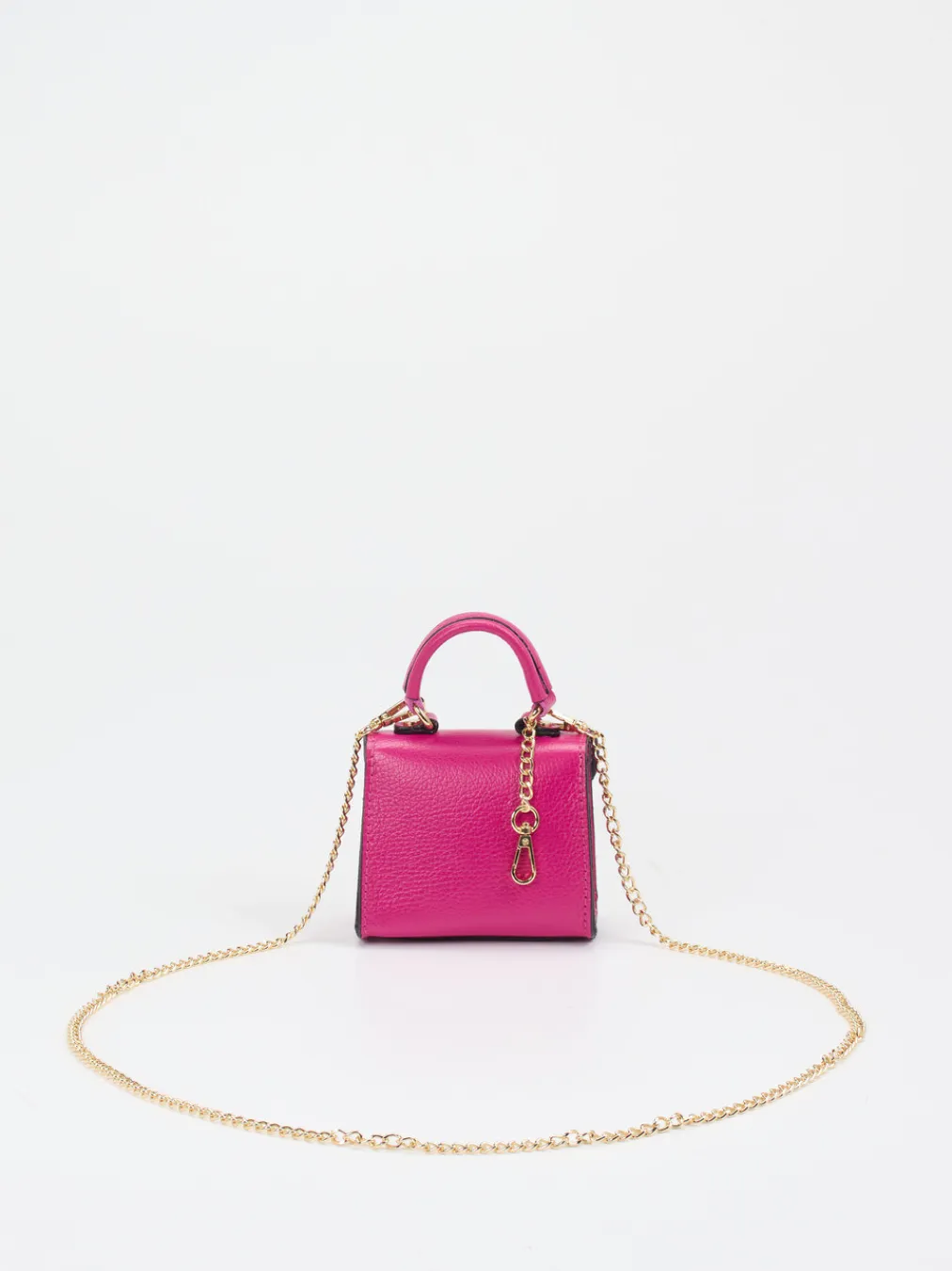 Bezaubernd ist diese Minitasche aus dem Hause Marlon Firenze. Das pinke Kalbleder wird zum Hingucker und peppt so jede Garderobe auf. Mit Hilfe der eleganten, goldfarbenen Schulterkette kann Sie lässig umgehängt werden. Schick ist die dekorative, goldfarbene Gürtelschnalle unter der sich ein praktischer Druckknopf verbirgt. Der Innenraum bietet Platz für ein kleines Portemonnaie und einen Lippenstift. An einem zusätzlichen, goldfarbenen Haken kann z.B. der Schlüssel befestigt werden. Ein süßes Accessoire, das Spaß macht! – Material: Kalbleder – Farbe: Pink – Größe: ca. 10 x 12 x 6 cm (H x B x T) – Verschluss: Druckknopf – Schulterriemen: ca. 115 cm, abnehmbar