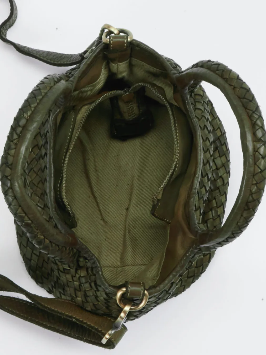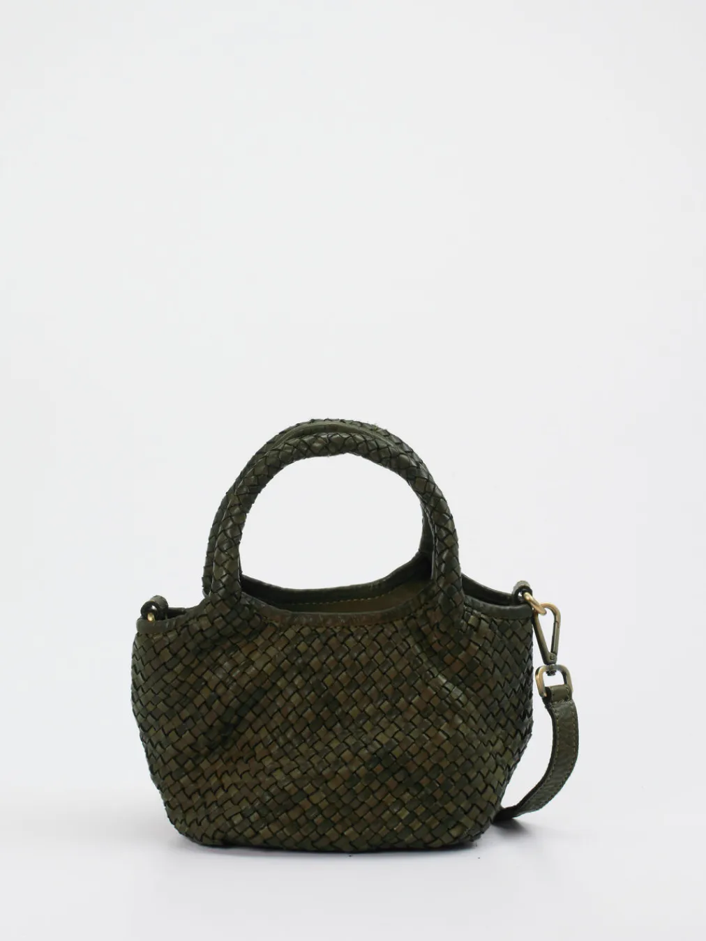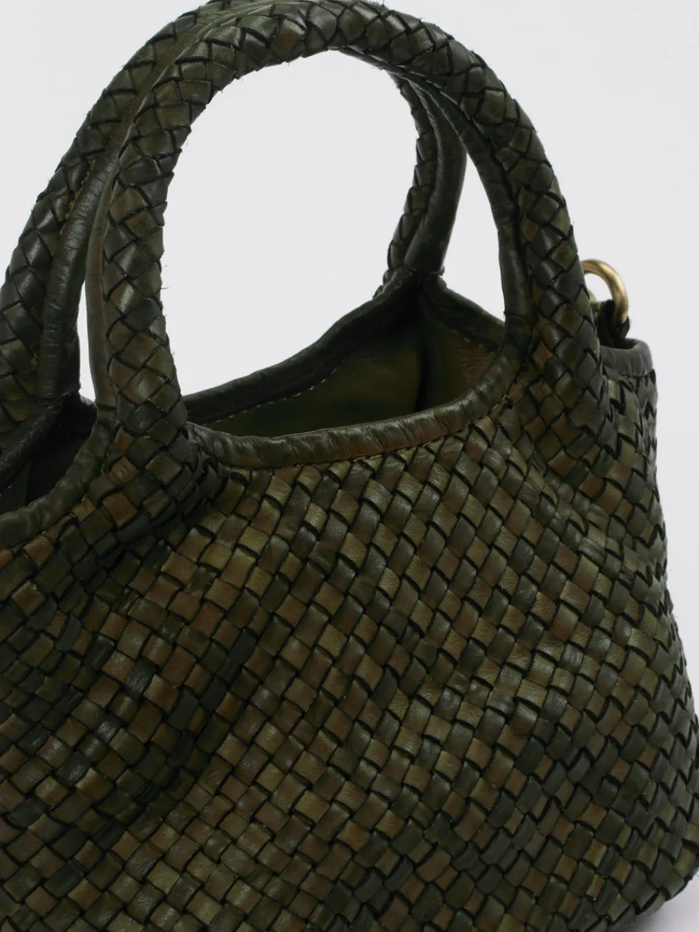 Fein geflochtenes Kalbleder in edlem Olivgrün trifft auf dezente Vintage-Elemente. Die vielseitige Mini Bag überzeugt durch hochwertige Verarbeitung und klare Formensprache.