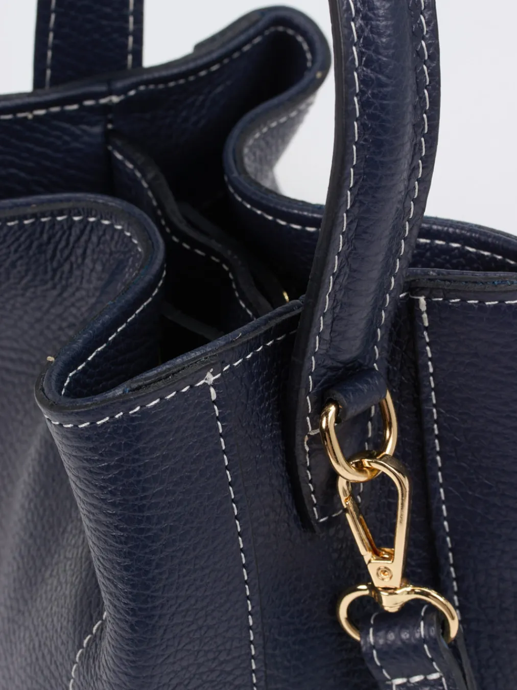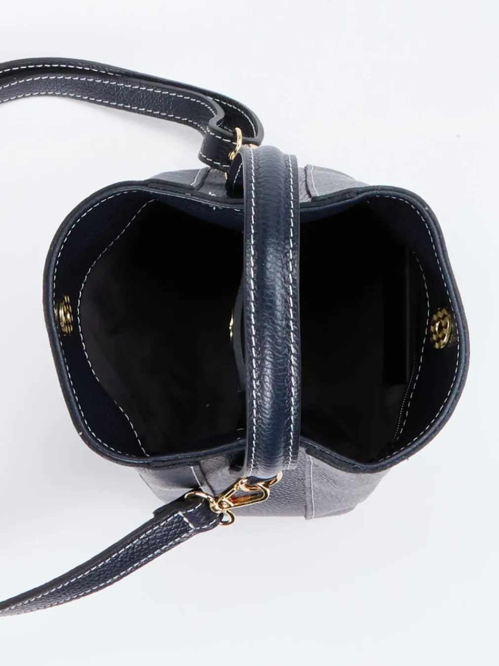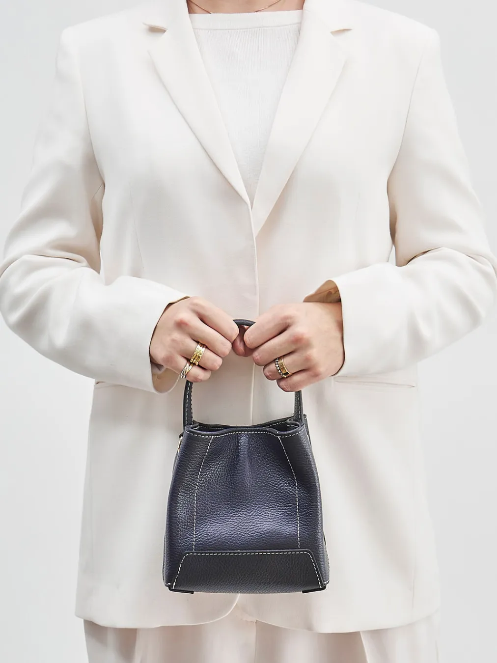 Die fein genarbte Oberfläche und goldene Hardware verleihen dieser Mini-Bucket-Bag von Marlon Firenze einen dezenten Luxus – ideal für cleane, moderne Looks.