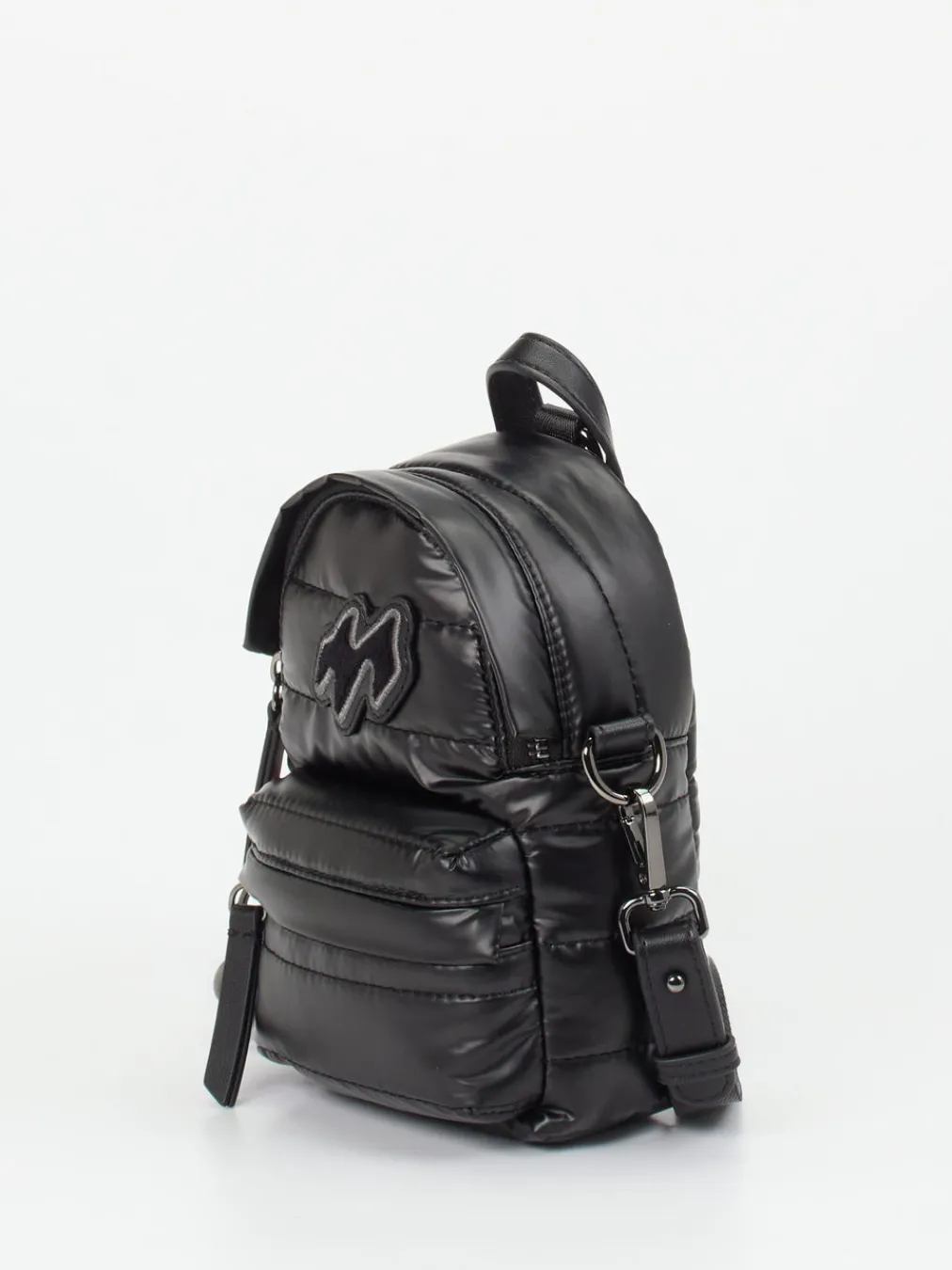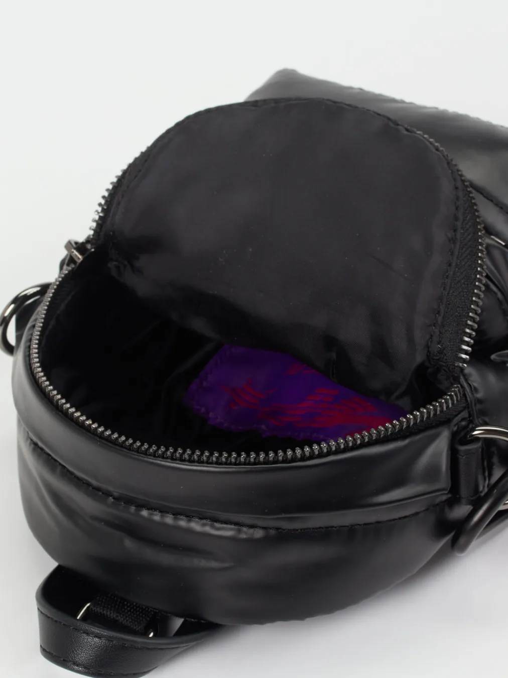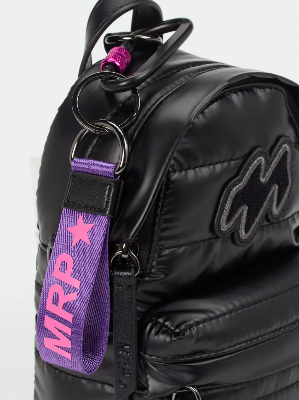 Der Mini-Rucksack von MRP verbindet glänzend gestepptes Nylon mit einem expressiven Farbakzent im Y2K-Stil – ein kompaktes Statement-Piece für modische City-Looks.