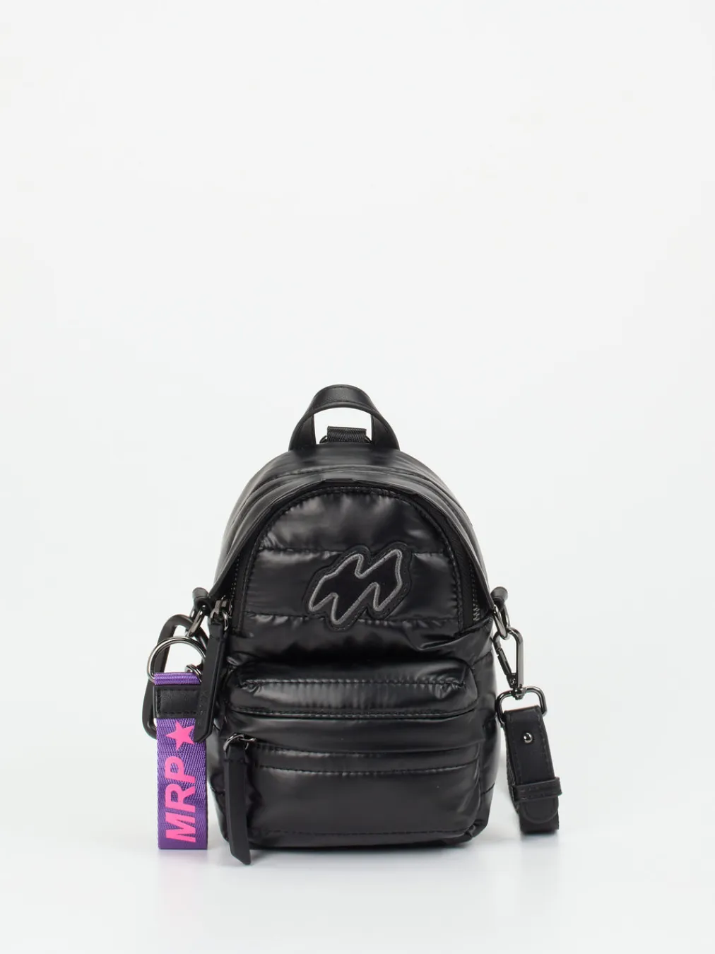 Diese Minitasche in Form eines Rucksacks der Marke MRP überzeugt mit ihrem pfiffigen Design. Schwarzes Polyester lässt sich vielfältig kombinieren, ist strapazierfähig und fühlt sich dabei angenehm weich an. Harmonisch fügt sich das lederne Markenlogo, das mit schwarzem Frottee und grauem Garn gefüllt ist, in den monochromatischen Look ein. Der Schulterriemen kann bei Bedarf abgenommen werden. Am seitlichen Karabinerhaken können weitere Gegenstände befestigt werden. Einen farblichen Akzent setzt hier das Band mit dem rosafarbene Markenlogo auf violettem Grund, was auf Wunsch abgenommen werden kann. Für einen zusätzlichen Stauraum sorgt die kleine Außentasche. Ein modisches Accessoire, das zum Eyecatcher wird! – Material: Polyester – Farbe: Schwarz – Maße: 18 x 14 x 5 cm ( H x B x T ) – Verschluss: Reißverschluss – Innen: ein Steckfach – Außen: ein Reißverschlussfach, ein Karabinerhaken