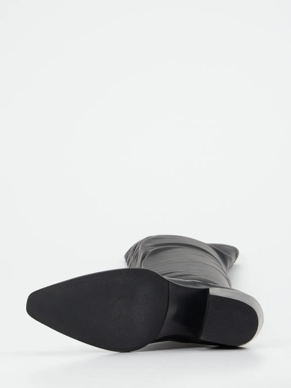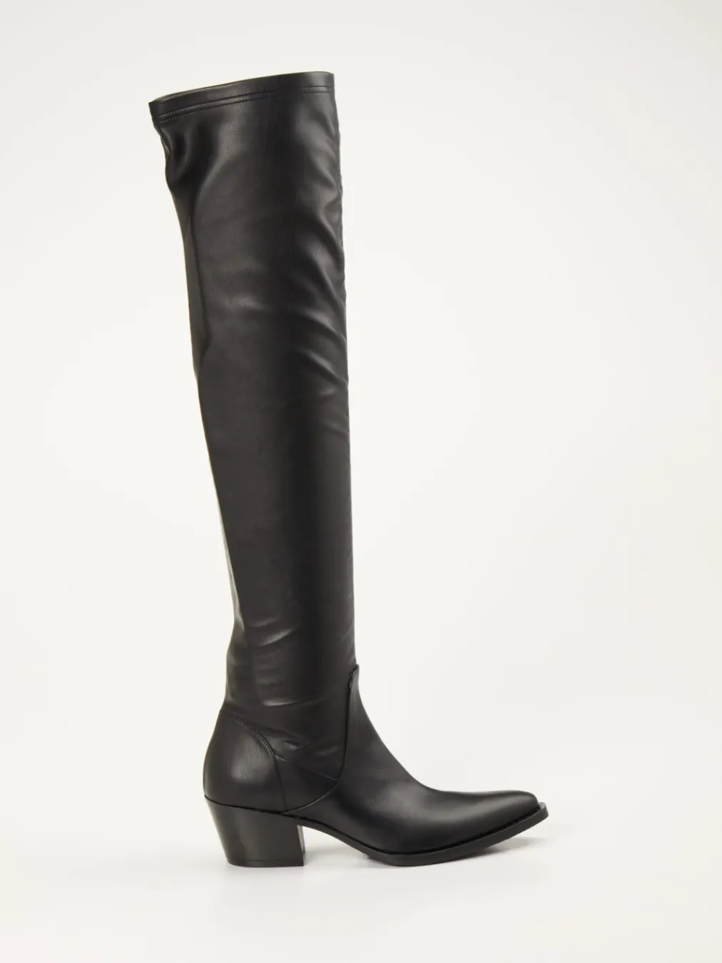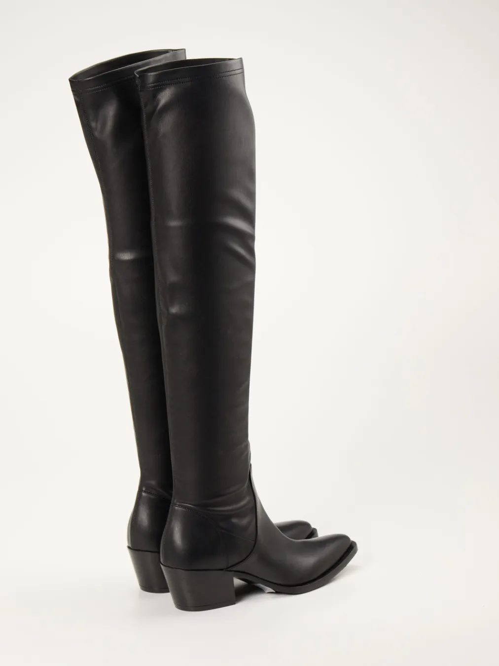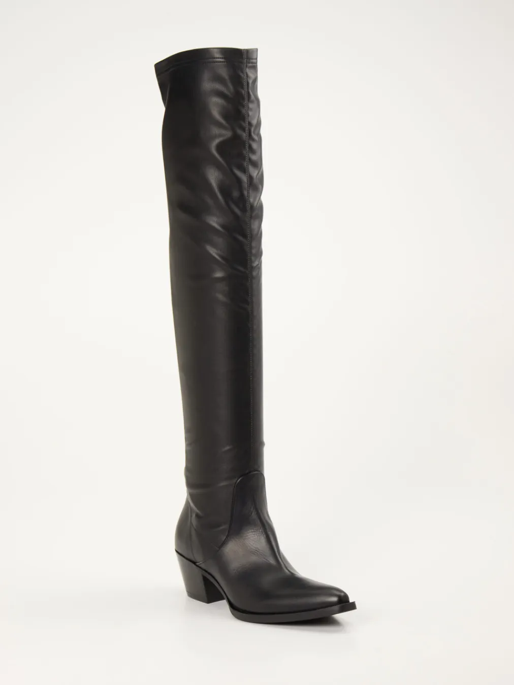 Der elegante Overknee-Stiefel vereint weiches Stretch-Kalbleder mit moderner Silhouette und dezenter Western-Note – eine stilvolle Wahl für minimalistisch inspirierte Looks.