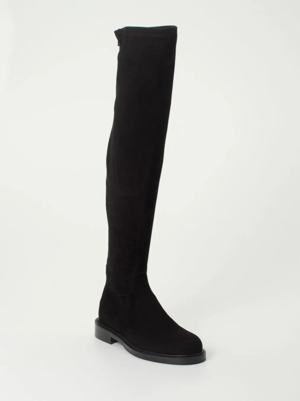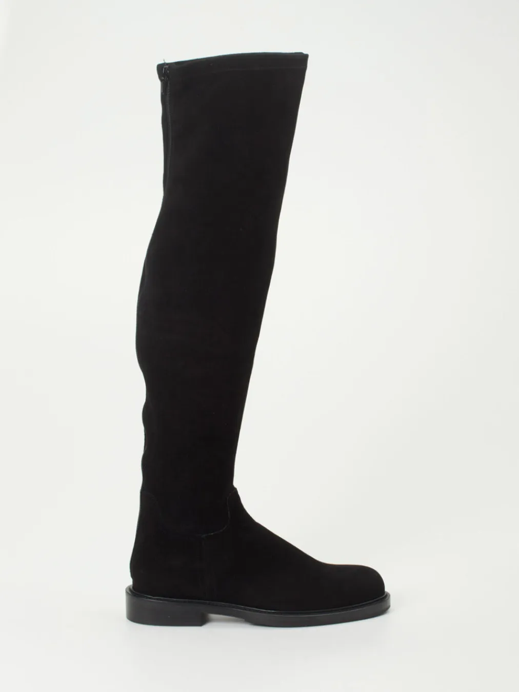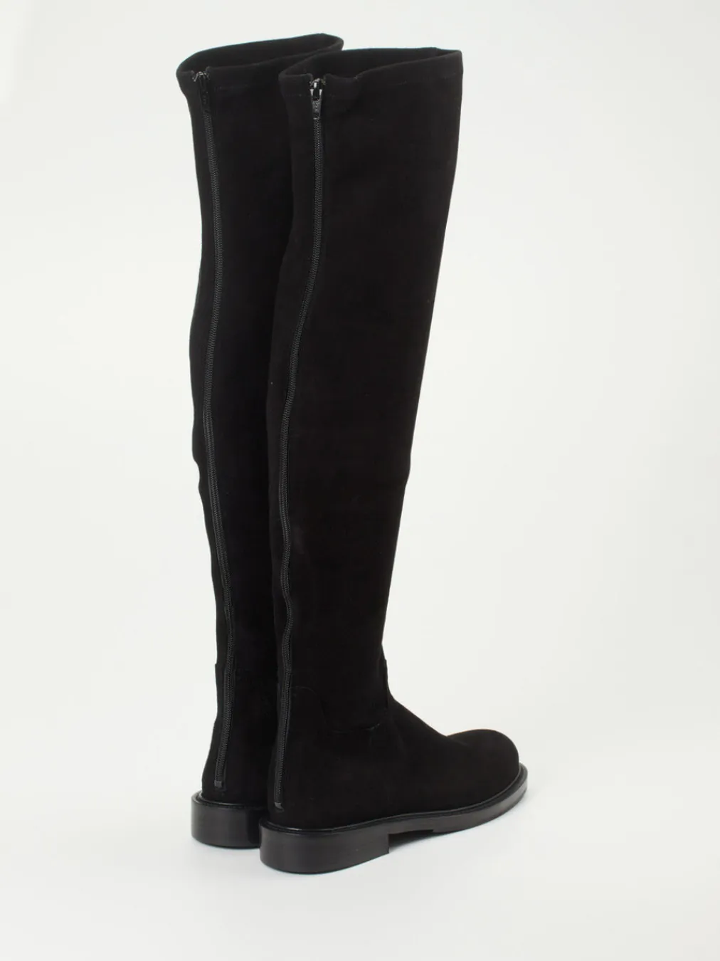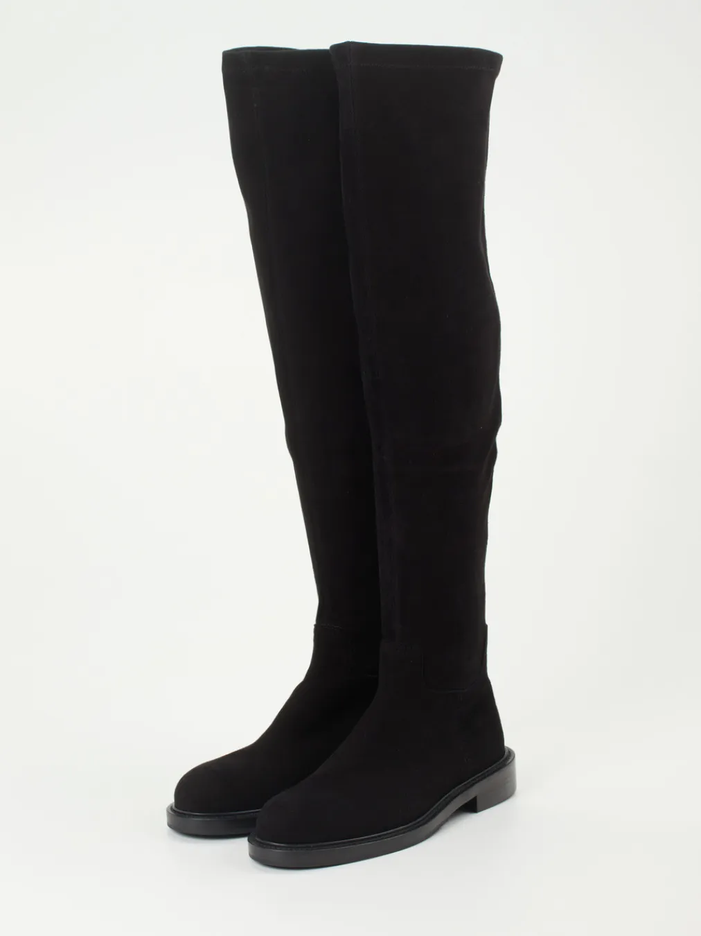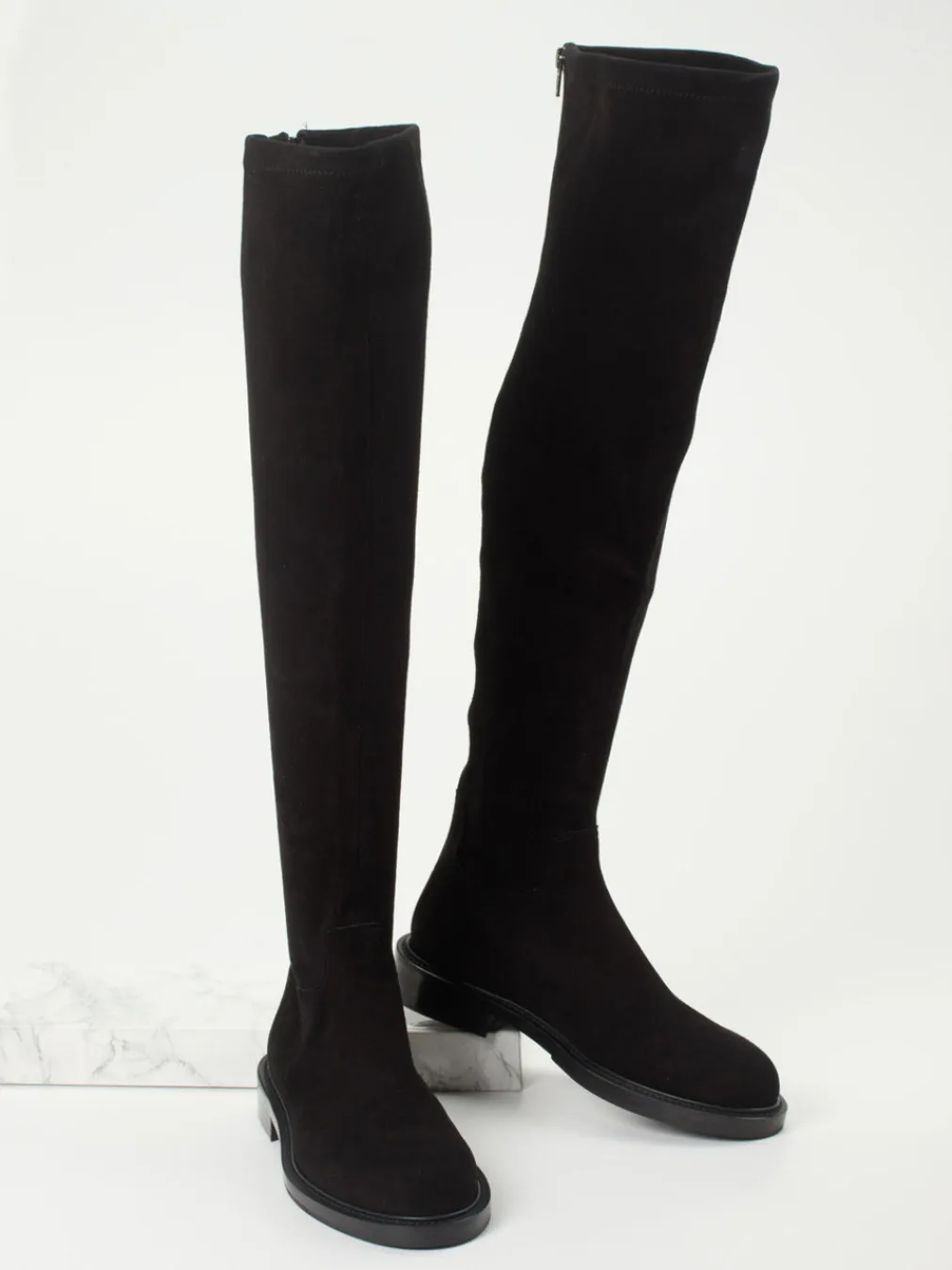 Minimalistisch, hochwertig und ausdrucksstark: Dieser Overknee-Stiefel aus samtigem Veloursleder vereint feminine Eleganz mit urbaner Leichtigkeit.